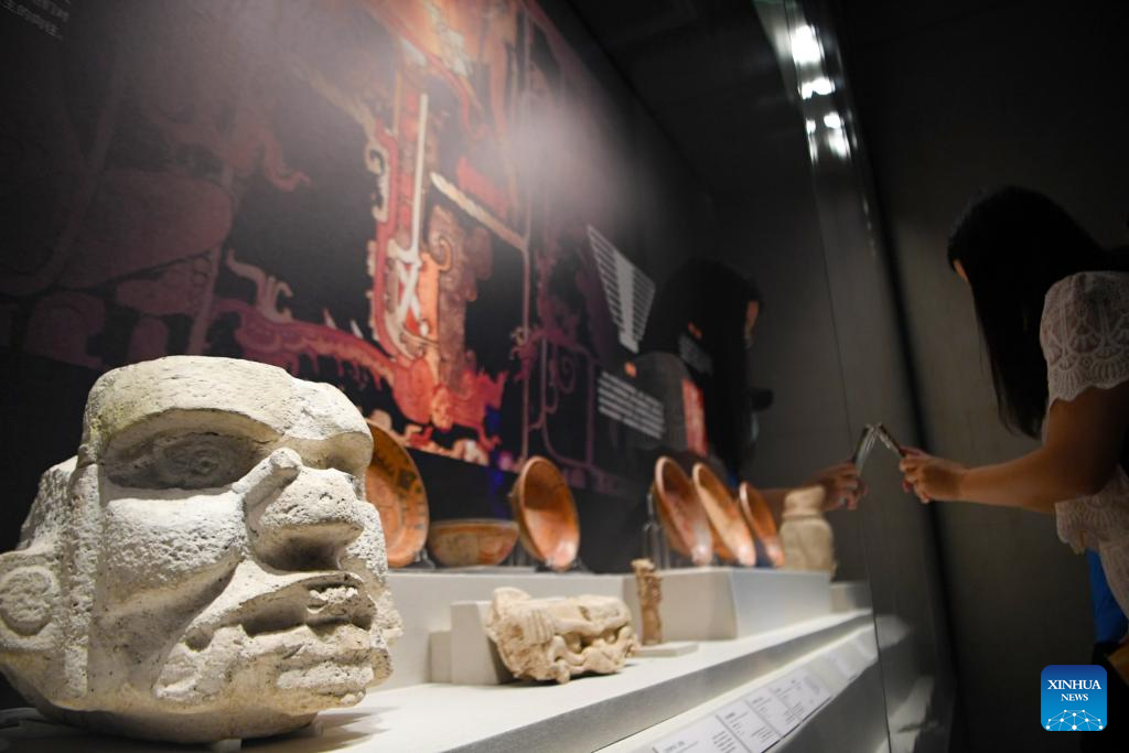ZHENGZHOU, 31 mayo, 2025 (Xinhua) -- Imagen del 30 de mayo de 2025 de personas observando exhibiciones en la exposición "Mayas, Ceiba y Cosmos" en el Museo de Henan, en Zhengzhou, en la provincia de Henan, en el centro de China. La exposición en curso ha atraído a numerosos visitantes, ofreciéndoles una oportunidad única de explorar las resonancias entre las civilizaciones china y maya y de mejorar los intercambios culturales entre China y México. (Xinhua/Hao Yuan)