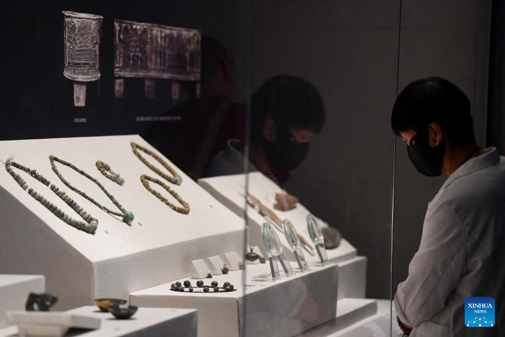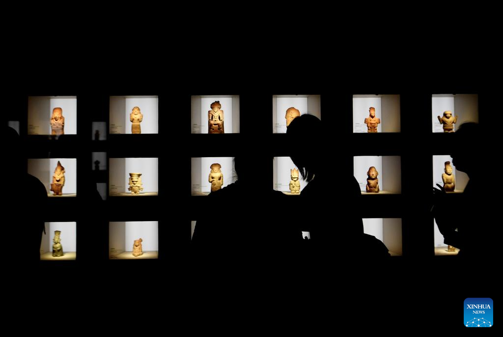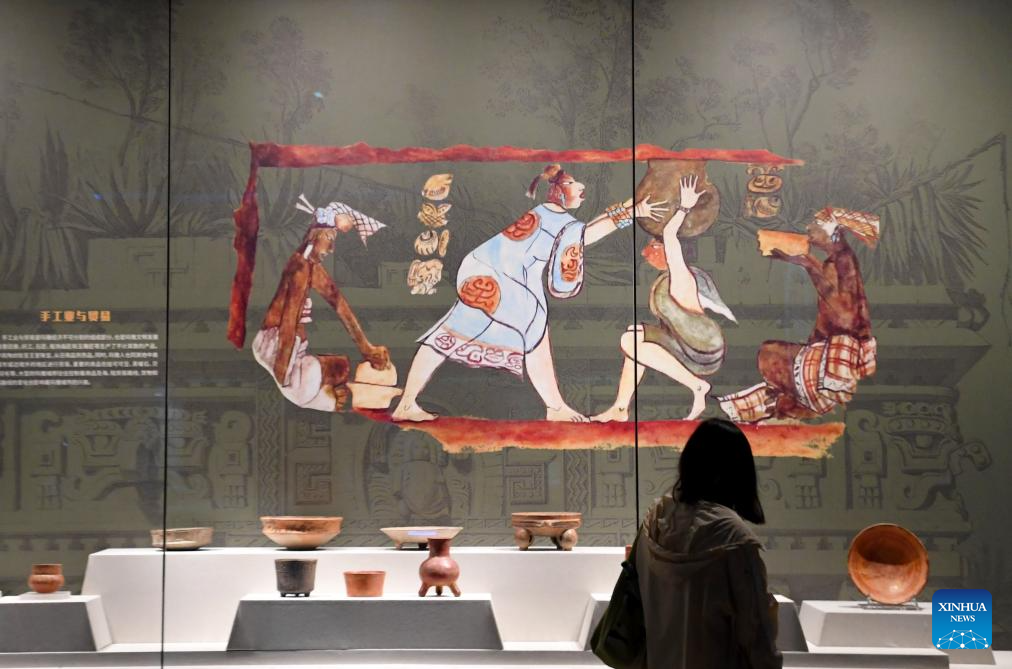 ZHENGZHOU, 31 mayo, 2025 (Xinhua) -- Imagen del 30 de mayo de 2025 de un visitante observando exhibiciones en la exposición "Mayas, Ceiba y Cosmos" en el Museo de Henan, en Zhengzhou, en la provincia de Henan, en el centro de China. La exposición en curso ha atraído a numerosos visitantes, ofreciéndoles una oportunidad única de explorar las resonancias entre las civilizaciones china y maya y de mejorar los intercambios culturales entre China y México. (Xinhua/Hao Yuan)