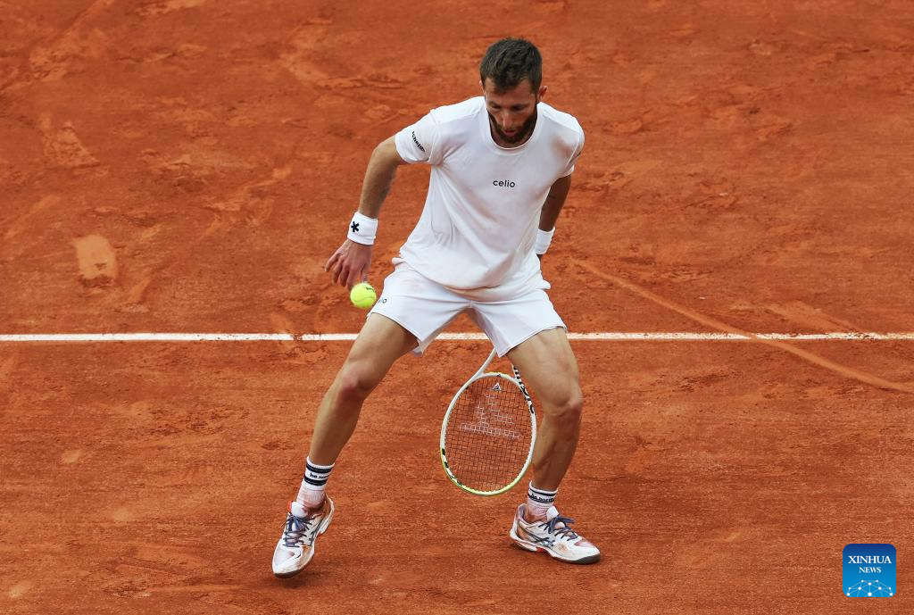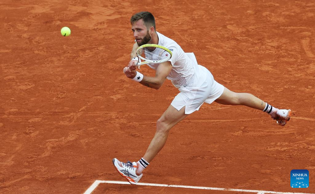 PARIS, 30 mayo, 2025 (Xinhua) -- Imagen del 29 de mayo de 2025 de Corentin Moutet, de Francia, compitiendo durante el partido de segunda ronda de individuales masculinos ante Novak Djokovic, de Serbia, en el torneo de tenis Abierto de Francia 2025, en París, Francia. (Xinhua/Gao Jing)