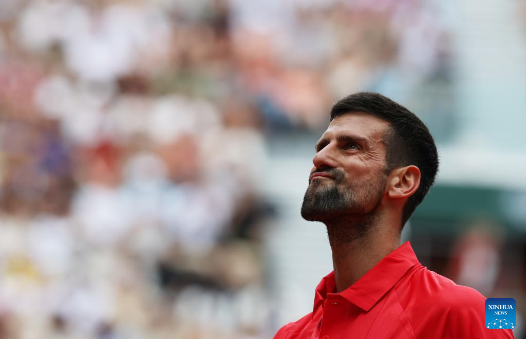 PARIS, 30 mayo, 2025 (Xinhua) -- Imagen del 29 de mayo de 2025 de Novak Djokovic, de Serbia, reaccionando durante el partido de segunda ronda de individuales masculinos ante Corentin Moutet, de Francia, en el torneo de tenis Abierto de Francia 2025, en París, Francia. (Xinhua/Gao Jing)