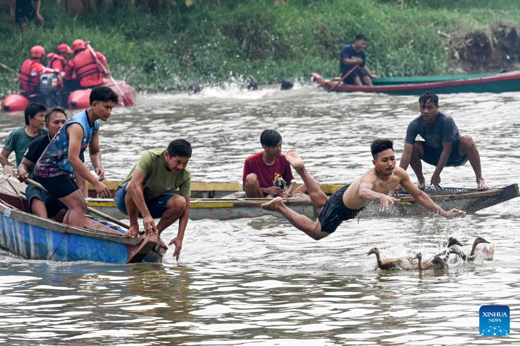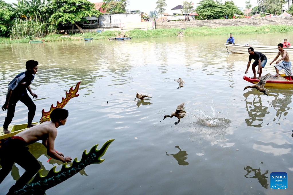 TANGERANG, 31 mayo, 2025 (Xinhua) -- Personas juegan a atrapar patos en celebración del Festival del Bote del Dragón en el río Cisadane, en Tangerang, en la provincia de Banten, Indonesia, el 31 de mayo de 2025. El Festival del Bote del Dragón, también conocido como Festival Duanwu, es una fiesta tradicional china para conmemorar al antiguo poeta chino, Qu Yuan, del Período de los Reinos Combatientes (475-221 a.C.). Celebrado el quinto día del quinto mes del calendario lunar chino, el festival cae el 31 de mayo este año. (Xinhua/Agung Kuncahya B.)