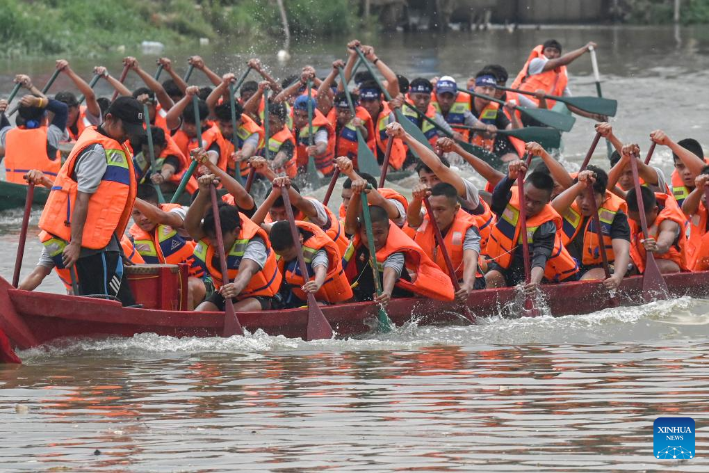 TANGERANG, 31 mayo, 2025 (Xinhua) -- Personas compiten en una carrera de botes del dragón en celebración del Festival del Bote del Dragón en el río Cisadane, en Tangerang, en la provincia de Banten, Indonesia, el 31 de mayo de 2025. El Festival del Bote del Dragón, también conocido como Festival Duanwu, es una fiesta tradicional china para conmemorar al antiguo poeta chino, Qu Yuan, del Período de los Reinos Combatientes (475-221 a.C.). Celebrado el quinto día del quinto mes del calendario lunar chino, el festival cae el 31 de mayo este año. (Xinhua/Agung Kuncahya B.)