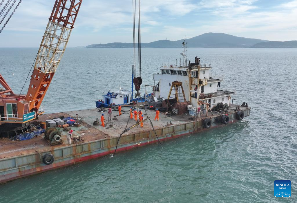 PINGTAN, 2 junio, 2025 (Xinhua) -- Imagen del 1 de junio de 2025 de trabajadores laborando en el sitio para la reparación de una sección del cable submarino, en Pingtan, en la provincia de Fujian, en el sureste de China. Una sección del cable submarino dañado el 24 de mayo en Pingtan, Fujian, en el sureste de China, fue reparado con éxito aquí el domingo. (Xinhua/Lin Shanchuan)