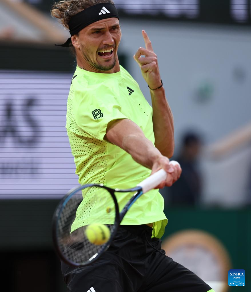 PARIS, 5 junio, 2025 (Xinhua) -- Imagen del 4 de junio de 2025 de Alexander Zverev devolviendo la pelota durante el partido de cuartos de final de individuales masculinos entre Alexander Zverev, de Alemania, y Novak Djokovic, de Serbia, en el torneo de tenis Abierto de Francia, en Roland Garros, en París, Francia. (Xinhua/Li Jing)