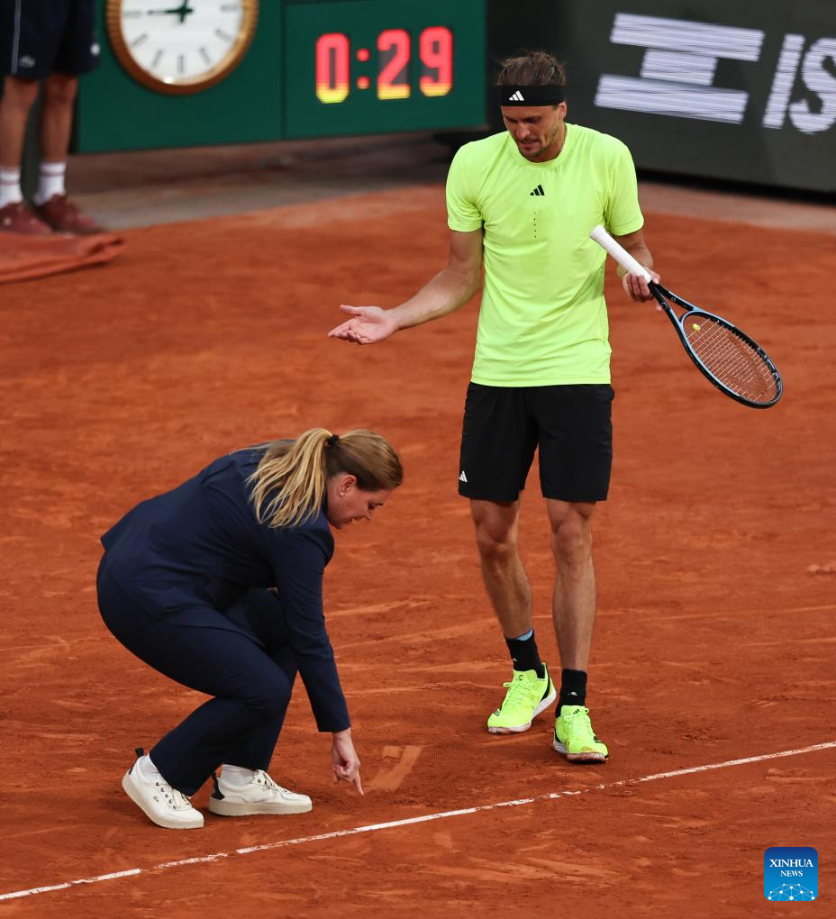 PARIS, 5 junio, 2025 (Xinhua) -- Imagen del 4 de junio de 2025 de Alexander Zverev discutiendo con la árbitra durante el partido de cuartos de final de individuales masculinos entre Alexander Zverev, de Alemania, y Novak Djokovic, de Serbia, en el torneo de tenis Abierto de Francia, en Roland Garros, en París, Francia. (Xinhua/Li Jing)