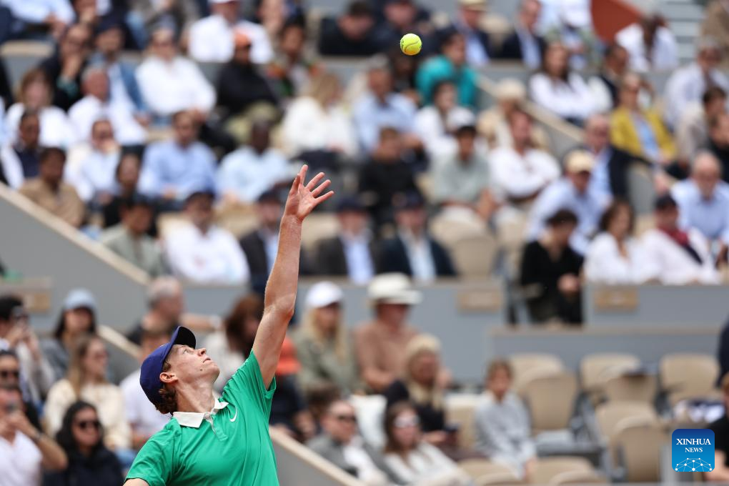 PARIS, 5 junio, 2025 (Xinhua) -- Imagen del 4 de junio de 2025 de Jannik Sinner sirviendo la pelota durante el partido de cuartos de final de individuales masculinos entre Jannik Sinner, de Italia, y Alexander Bublik, de Kazajistán, en el torneo de tenis Abierto de Francia, en Roland Garros, en París, Francia. (Xinhua/Li Jing)