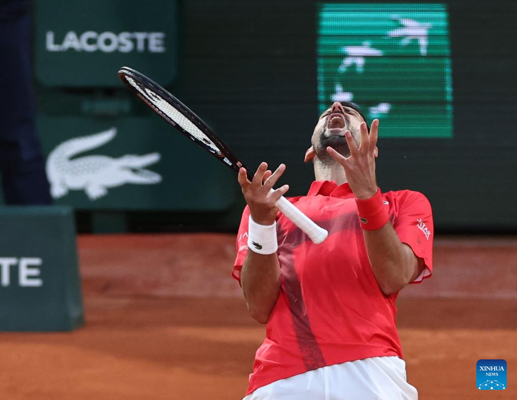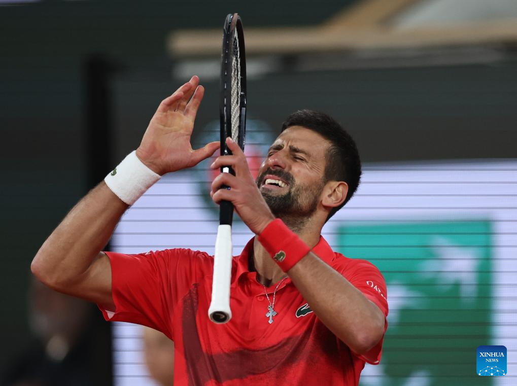 PARÍS, 7 junio, 2025 (Xinhua) -- Imagen del 6 de junio de 2025 de Novak Djokovic reaccionando durante el partido de semifinal de individuales masculinos entre Jannik Sinner, de Italia, y Novak Djokovic, de Serbia, en el torneo de tenis Abierto de Francia, en Roland Garros, en París, Francia. (Xinhua/Li Jing)
