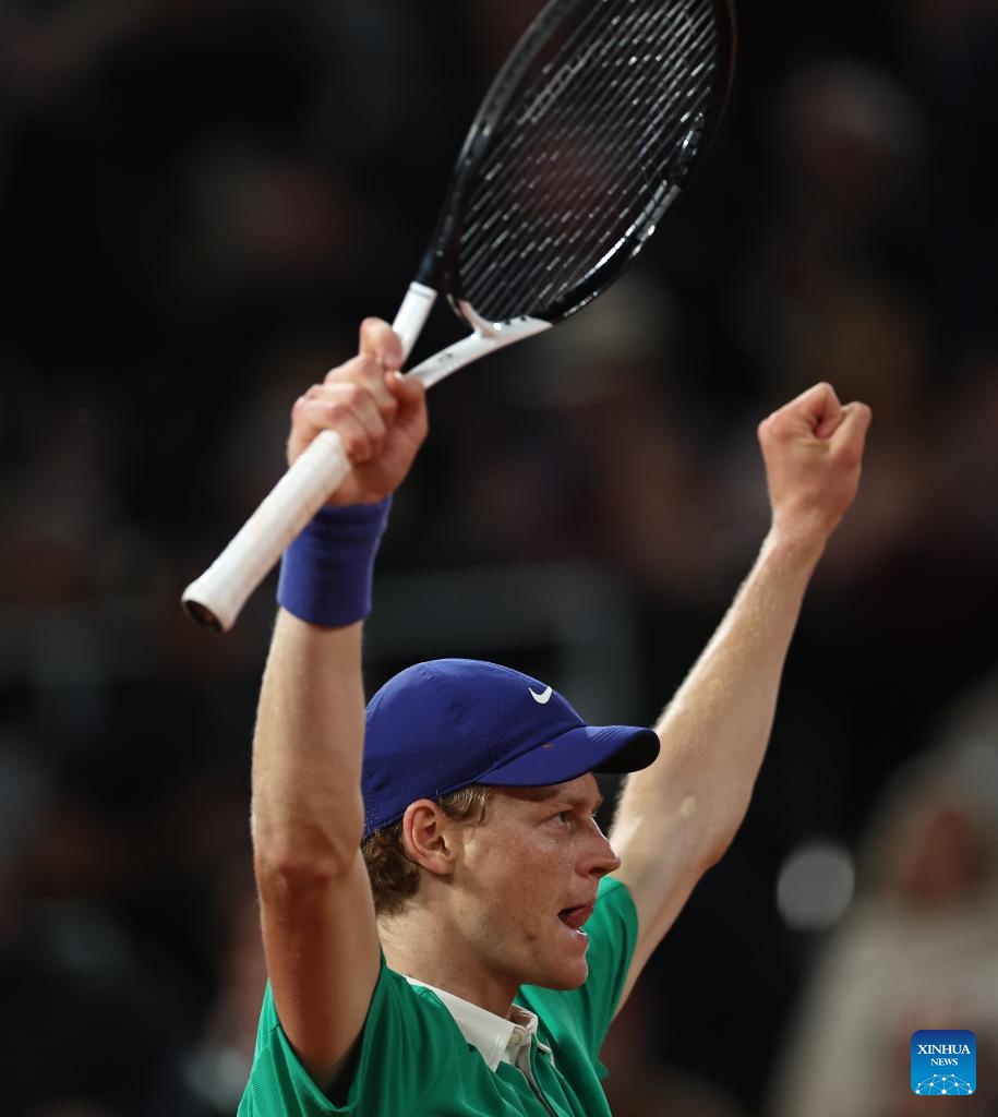 PARÍS, 7 junio, 2025 (Xinhua) -- Imagen del 6 de junio de 2025 de Jannik Sinner festejando después de ganar el partido de semifinal de individuales masculinos entre Jannik Sinner, de Italia, y Novak Djokovic, de Serbia, en el torneo de tenis Abierto de Francia, en Roland Garros, en París, Francia. (Xinhua/Li Jing)