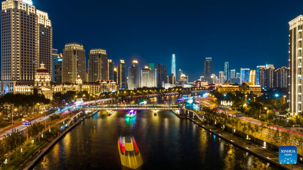 TIANJIN, 7 junio, 2025 (Xinhua) -- Imagen tomada con un dron el 6 de junio de 2025 de cruceros navegando por el río Haihe, en Tianjin, en el norte de China. Tianjin ha mejorado las instalaciones de iluminación de 216 edificios, 13 puentes, 8,2 kilómetros de riberas y 7 muelles a lo largo del río Haihe desde principios de este año. La iluminación paisajística a lo largo del río ha mejorado enormemente, ofreciendo una vista nocturna distintiva de la ciudad. (Xinhua/Zhao Zishuo)