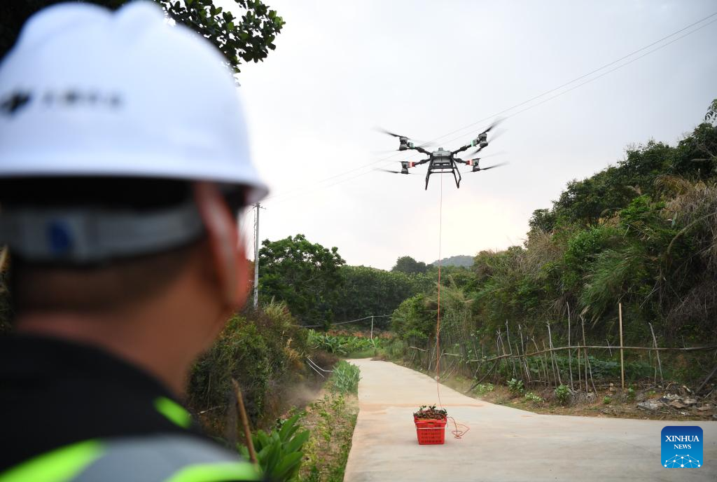 MAOMING, 7 junio, 2025 (Xinhua) -- Imagen del 5 de junio de 2025 de un trabajador operando un dron cargado con una canasta de lichis para aterrizar en un huerto, en Gaozhou de la ciudad de Maoming, en la provincia de Guangdong, en el sur de China. En medio de la intensa cosecha de lichis frescos en Maoming, conocida como la "ciudad natal de los lichis", se ha adoptado la tecnología de drones en el transporte y la entrega para superar los obstáculos logísticos y garantizar la calidad de la fruta. (Xinhua/Deng Hua)