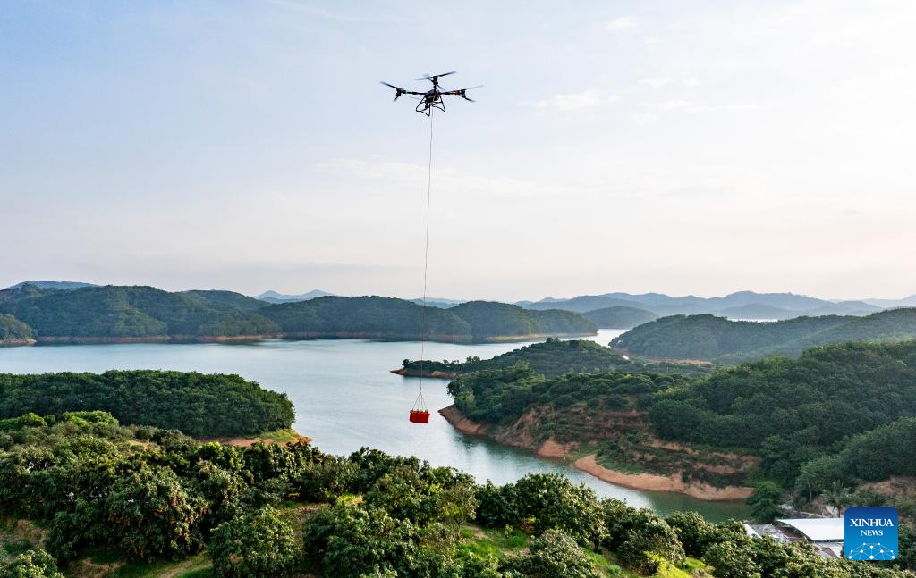 MAOMING, 7 junio, 2025 (Xinhua) -- Imagen del 5 de junio de 2025 de un dron entregando una canasta de lichis en un huerto, en Gaozhou de la ciudad de Maoming, en la provincia de Guangdong, en el sur de China. En medio de la intensa cosecha de lichis frescos en Maoming, conocida como la "ciudad natal de los lichis", se ha adoptado la tecnología de drones en el transporte y la entrega para superar los obstáculos logísticos y garantizar la calidad de la fruta. (Xinhua/Ding Hongfa)