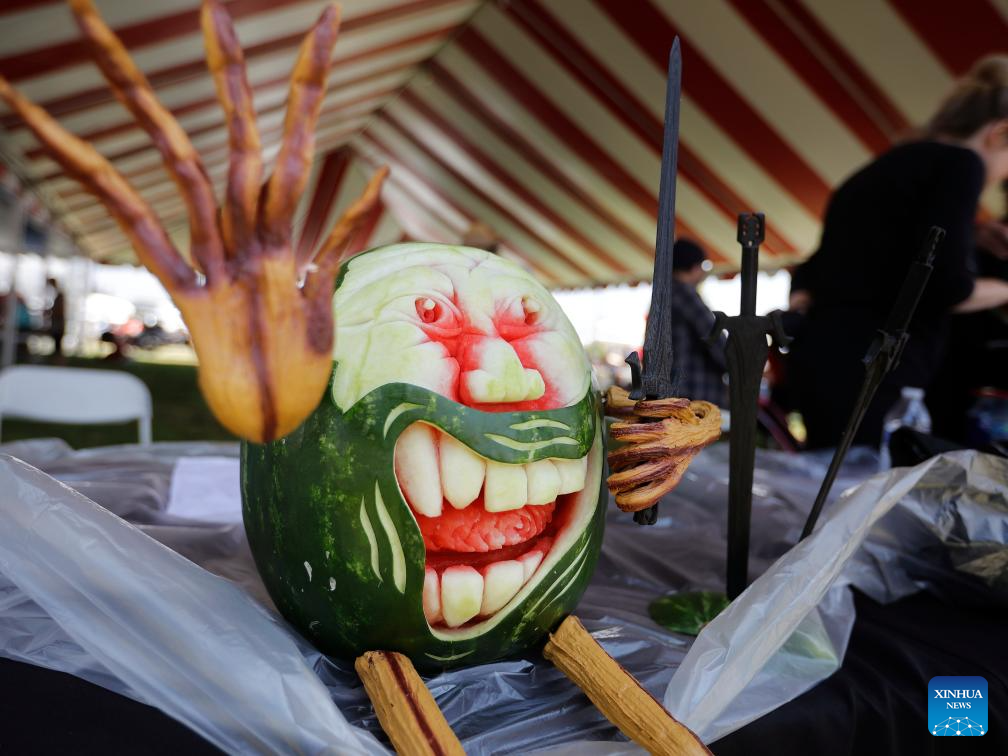 LOS ANGELES, 8 junio, 2025 (Xinhua) -- Imagen del 7 de junio de 2025 de una sandía tallada vista durante el Festival de la Sandía de California 2025 en el Parque de la Presa Hansen, en Los Angeles, California, Estados Unidos. (Xinhua/Qiu Chen)