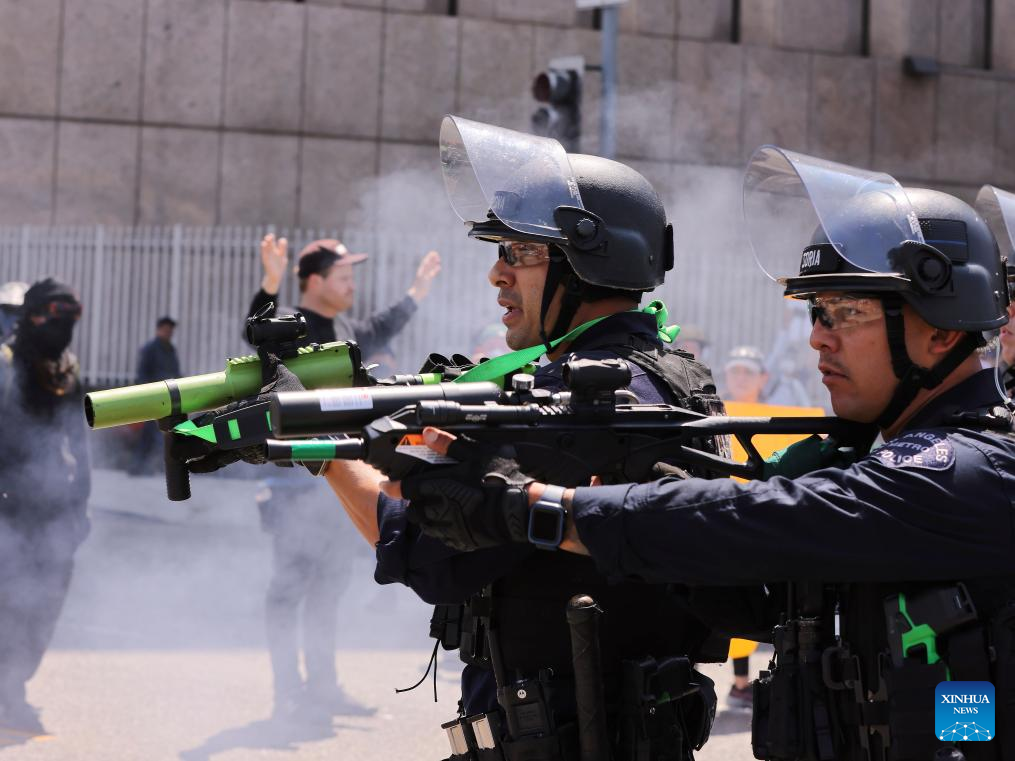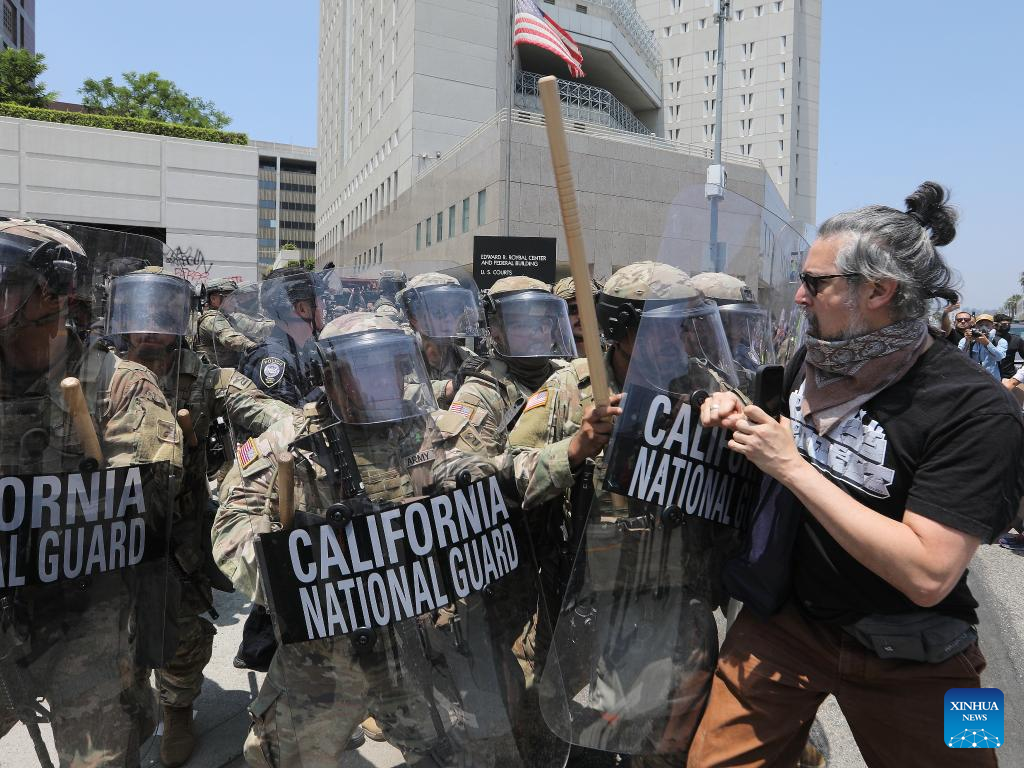 LOS ÁNGELES, 8 jun (Xinhua) -- Más de 1.000 manifestantes se enfrentaron este domingo a tropas de la Guardia Nacional en el centro de Los Ángeles en protesta contra las redadas contra inmigrantes realizadas en toda California durante el fin de semana.