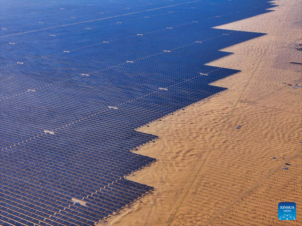 HOHHOT, 9 junio, 2025 (Xinhua) -- Vista aérea tomada con un dron el 5 de junio de 2025 de un proyecto fotovoltaico, en el Desierto de Kubuqi, en la región autónoma de Mongolia Interior, en el norte de China. En los desiertos de Kubuqi y Ulan Buh, el modelo de control de arena con proyectos fotovoltaicos se ha implementado ampliamente, transformando franjas de terreno arenoso en vastos "mares azules" rebosantes de energía verde. (Xinhua/Lian Zhen)