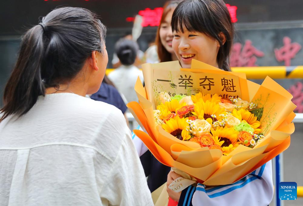 BEIJING, 9 junio, 2025 (Xinhua) -- Una estudiante recibe flores después del examen en un sitio del examen nacional de ingreso a la universidad, en la ciudad de Qinhuangdao, en la provincia de Hebei, en el norte de China, el 9 de junio de 2025. El examen nacional de ingreso a la universidad de este año, también conocido como gaokao, comenzó el 7 de junio de este año. En algunas regiones, el examen finalizó el lunes. (Xinhua/Cao Jianxiong)