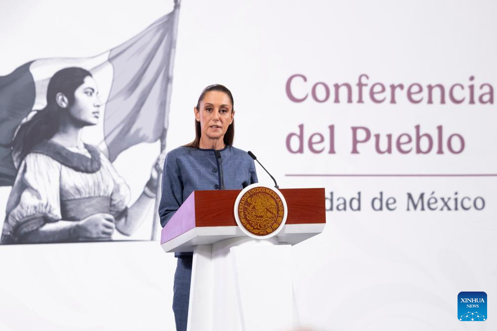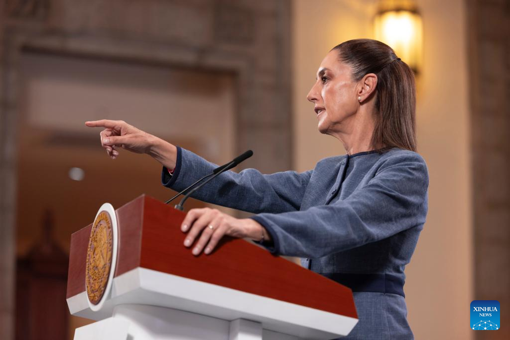 CIUDAD DE MEXICO, 9 junio, 2025 (Xinhua) -- Imagen cedida por la Presidencia de México de la presidenta mexicana, Claudia Sheinbaum, hablando durante su conferencia de prensa matutina, en Palacio Nacional, en la Ciudad de México, capital de México, el 9 de junio de 2025. Sheinbaum pidió el lunes a las autoridades estadounidenses apegarse a derecho en sus procedimientos migratorios y respetar la dignidad de las personas, tras las detenciones y protestas de migrantes de los últimos días en la ciudad de Los Angeles, en el estado de California. (Xinhua/Presidencia de México)
