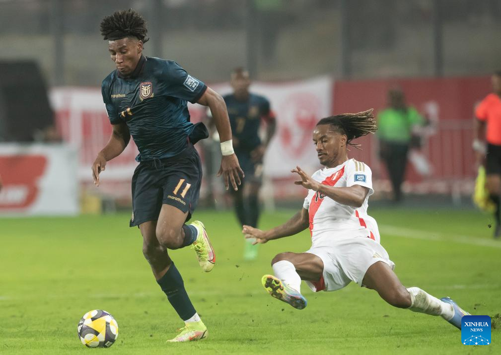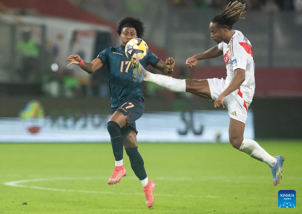LIMA, 11 junio, 2025 (Xinhua) -- Imagen del 10 de junio de 2025 de André Carrillo (d), de Perú, disputando el balón con Kevin Rodríguez (i), de Ecuador, durante el partido correspondiente a las Eliminatorias Sudamericanas para el Mundial de Estados Unidos, México y Canadá 2026 celebrado en el Estadio Nacional, en Lima, Perú. (Xinhua/Mariana Bazo)