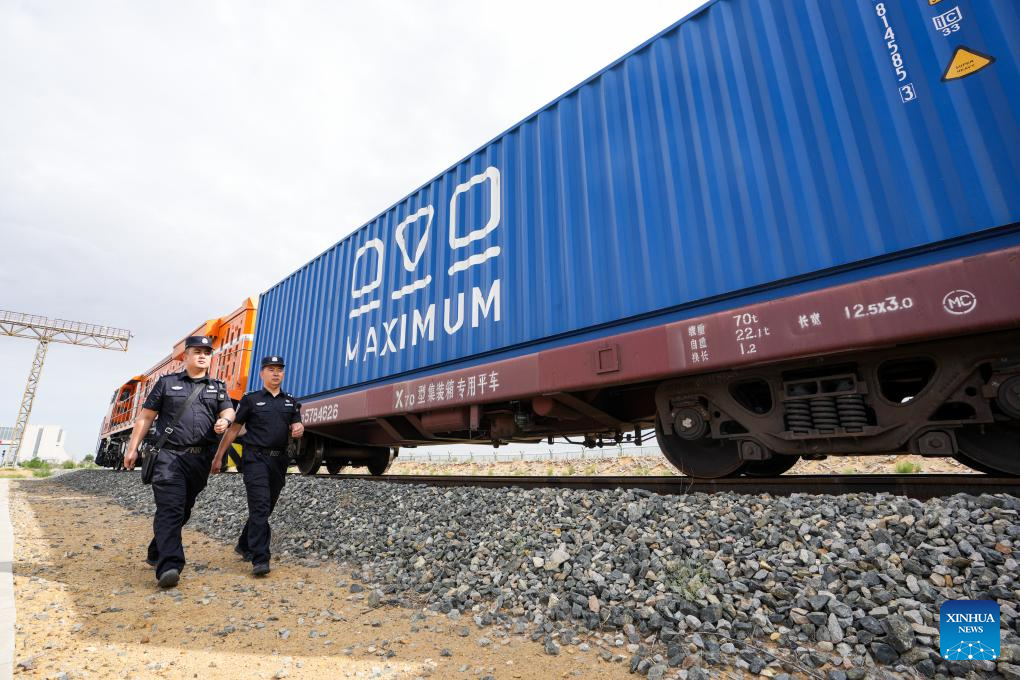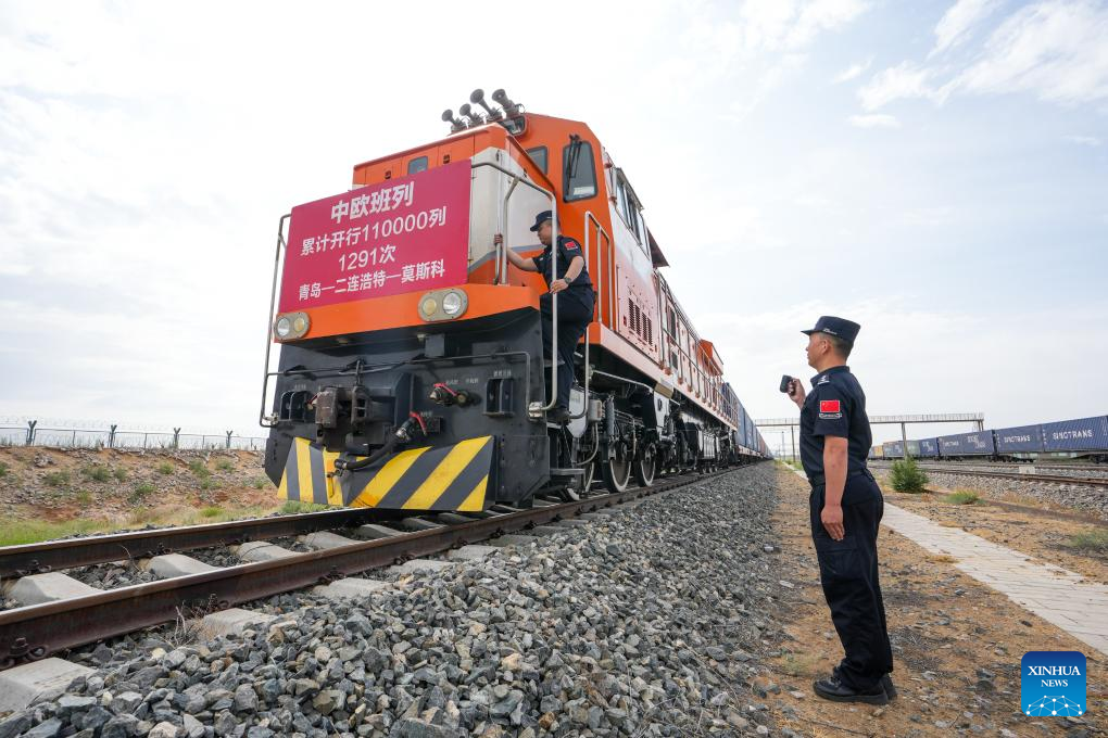 HOHHOT, 12 jun (Xinhua) -- El tren de carga China-Europa número 110.000 abandonó hoy jueves el territorio chino a través del puerto de Erenhot, en el norte de China.