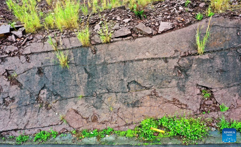 BEIJING, 12 junio, 2025 (Xinhua) -- Imagen del 27 de abril de 2025 de las huellas descubiertas en el distrito de Huaiji, en la ciudad de Zhaoqing, en la provincia de Guangdong, en el sur de China. Un equipo de investigación de la Universidad de Geociencias de China (Beijing) anunció el jueves que ha registrado, por primera vez, una combinación de huellas de mamaliaforme y dinosaurio en estratos del Cretácico en el distrito de Huaiji, en la ciudad de Zhaoqing de la provincia de Guangdong, en el sur de China. La huella de mamaliaforme recién descubierta mide tan solo 1,8 centímetros de longitud, según el equipo de investigación. (Xinhua/Liang Xuanrui)