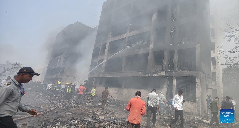 Personas y rescatistas son vistos en el sitio donde un avión se estrelló, en Ahmedabad, en el estado de Gujarat, India, el 12 de junio de 2025. (Xinhua/UNI)