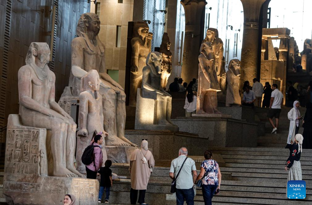 GIZA, 12 junio, 2025 (Xinhua) -- Turistas visitan el Gran Museo Egipcio, en Giza, Egipto, el 12 de junio de 2025. Ubicado cerca de las pirámides de Giza, el Gran Museo Egipcio, con una superficie de más de 500.000 metros cuadrados y más de 100.000 objetos, abrirá oficialmente sus puertas el 3 de julio de este año. (Xinhua/Sui Xiankai)