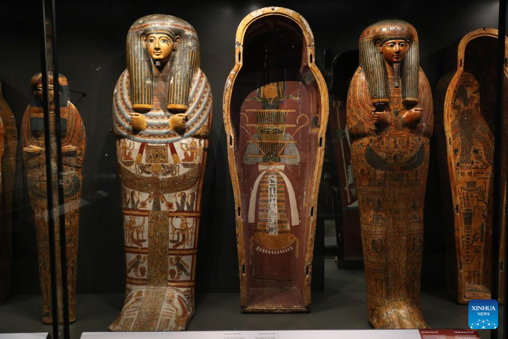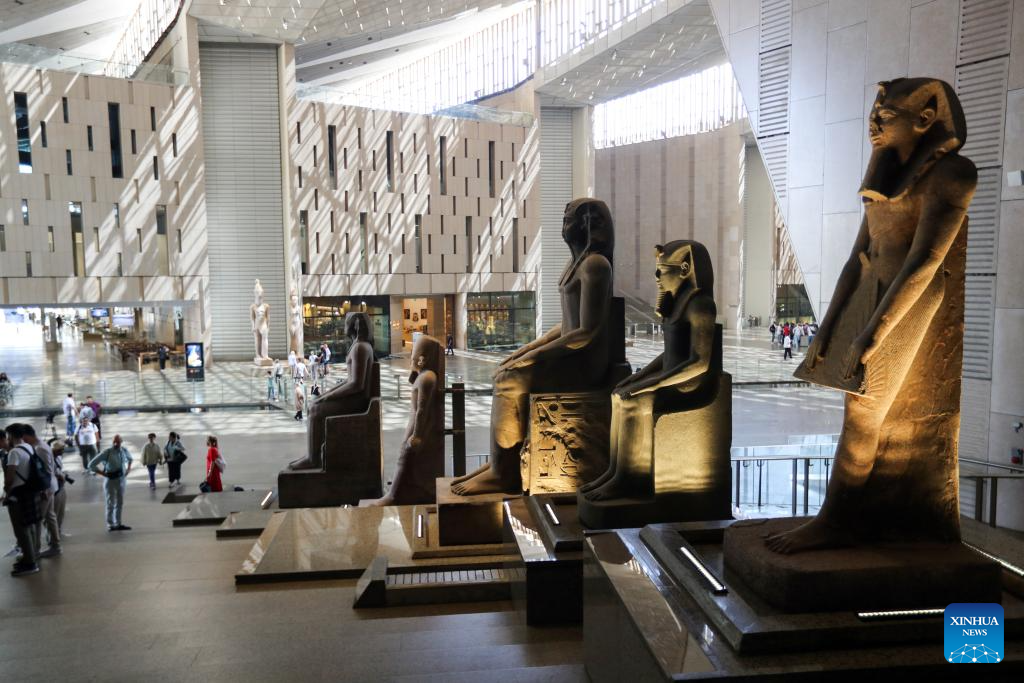 GIZA, 12 junio, 2025 (Xinhua) -- Imagen del 12 de junio de 2025 de objetos exhibidos en el Gran Museo Egipcio, en Giza, Egipto. Ubicado cerca de las pirámides de Giza, el Gran Museo Egipcio, con una superficie de más de 500.000 metros cuadrados y más de 100.000 objetos, abrirá oficialmente sus puertas el 3 de julio de este año. (Xinhua/Sui Xiankai)