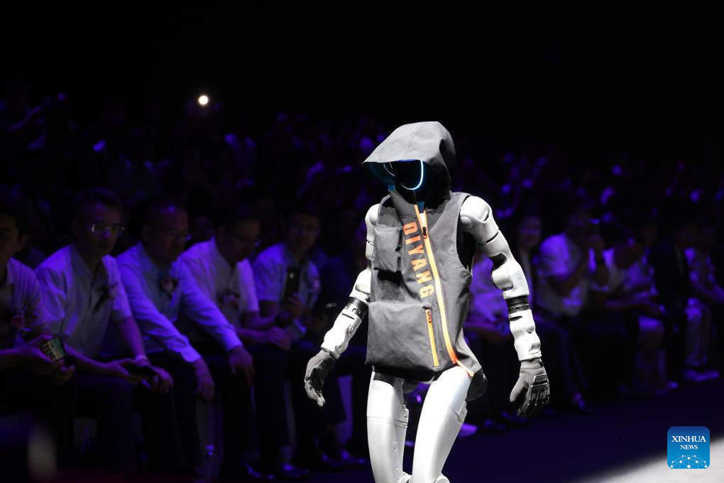 TIANJIN, 13 junio, 2025 (Xinhua) -- Imagen del 12 de junio de 2025 de un modelo robot humanoide presentando una creación en la Semana de la Moda de Tianjin 2025, en Tianjin, en el norte de China. El evento de moda se inauguró aquí el jueves. (Xinhua/Sun Fanyue)