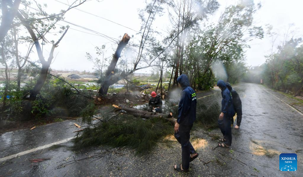 LEDONG, 13 junio, 2025 (Xinhua) -- Trabajadores limpian árboles derrumbados por el tifón Wutip en una autopista, en el distrito autónomo de la etnia li de Ledong, en la provincia de Hainan, en el sur de China, el 13 de junio de 2025. A medida que el tifón Wutip continuaba fortaleciéndose, el servicio meteorológico provincial mantuvo una alerta de tifón de nivel III hasta las 11:00 horas del viernes. (Xinhua/Yang Guanyu)