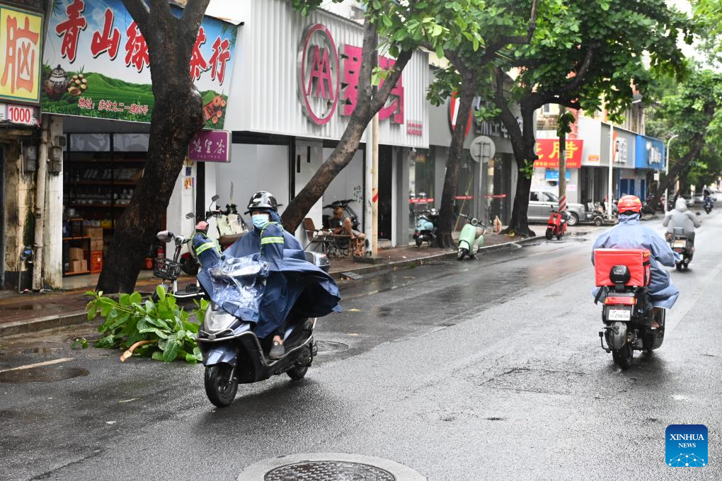 Personas circulan por una calle bajo la lluvia, en la ciudad de Zhanjiang, en la provincia de Guangdong, en el sur de China, el 14 de junio de 2025. El tifón Wutip, el primero de este año, tocó tierra por segunda vez cerca de la ciudad de Leizhou, en la provincia meridional china de Guangdong, alrededor de las 12:30 horas del sábado, informó el observatorio meteorológico provincial. (Xinhua/Xiao Ennan)