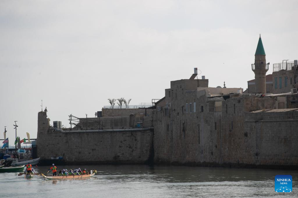 ACRE, 14 junio, 2025 (Xinhua) -- Imagen del 12 de junio de 2025 de personas remando en botes del dragón durante un evento de botes del dragón, en la ciudad de Acre, en el norte de Israel. Un evento cultural chino centrado en las carreras de botes del dragón se llevó a cabo el jueves en la antigua ciudad israelí de Acre. Más de 300 participantes compitieron en las tradicionales carreras de botes a lo largo de la costa mediterránea. (Xinhua/Chen Junqing)
