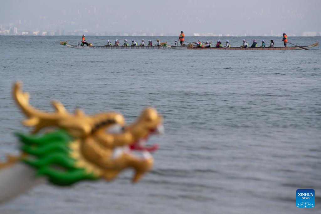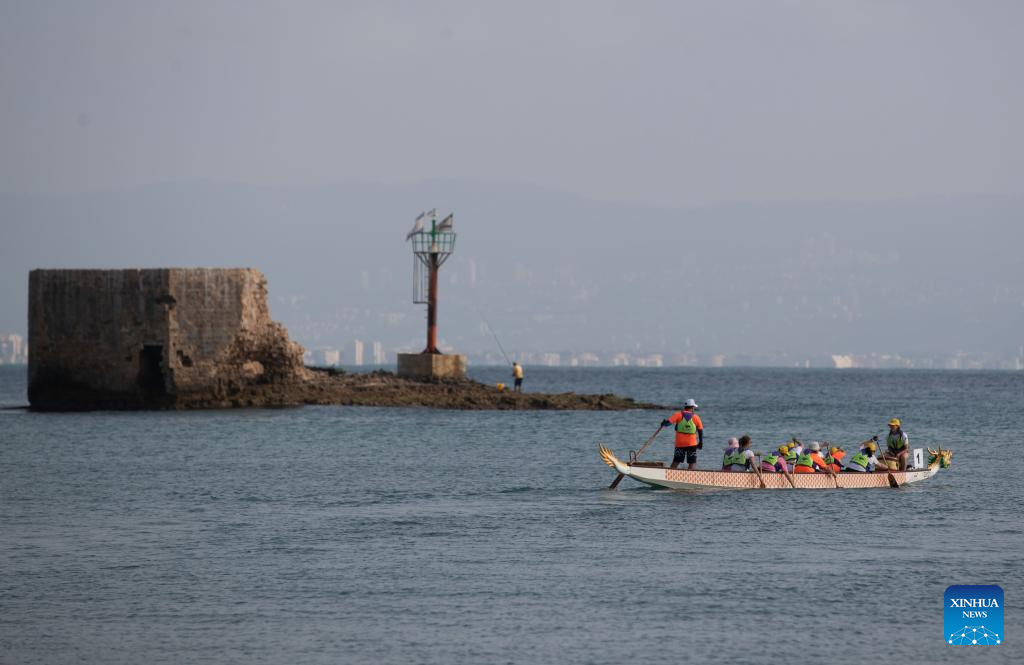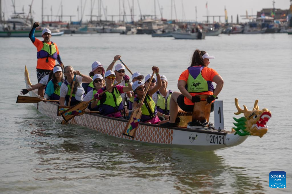 ACRE, 14 junio, 2025 (Xinhua) -- Imagen del 12 de junio de 2025 de personas remando en un bote del dragón durante un evento de botes del dragón, en la ciudad de Acre, en el norte de Israel. Un evento cultural chino centrado en las carreras de botes del dragón se llevó a cabo el jueves en la antigua ciudad israelí de Acre. Más de 300 participantes compitieron en las tradicionales carreras de botes a lo largo de la costa mediterránea. (Xinhua/Chen Junqing)