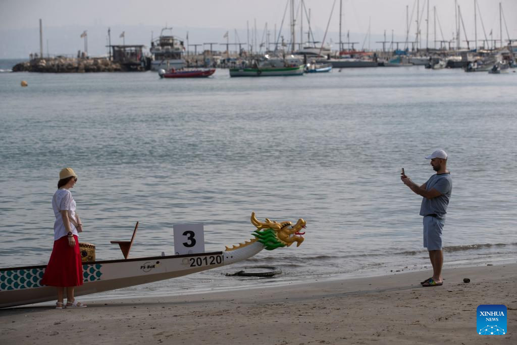ACRE, 14 junio, 2025 (Xinhua) -- Imagen del 12 de junio de 2025 de una mujer posando para una fotografía con un bote del dragón durante un evento de botes del dragón, en la ciudad de Acre, en el norte de Israel. Un evento cultural chino centrado en las carreras de botes del dragón se llevó a cabo el jueves en la antigua ciudad israelí de Acre. Más de 300 participantes compitieron en las tradicionales carreras de botes a lo largo de la costa mediterránea. (Xinhua/Chen Junqing)