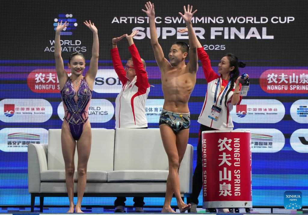 XI'AN, 14 junio, 2025 (Xinhua) -- Guo Muye/Guo Sitong, de China, festejan al término del evento de dúo técnico mixto en la Superfinal de la Copa del Mundo de Natación Artística 2025 de World Aquatics, en Xi'an, en la provincia de Shaanxi, en el noroeste de China, el 14 de junio de 2025. (Xinhua/Li Yibo)