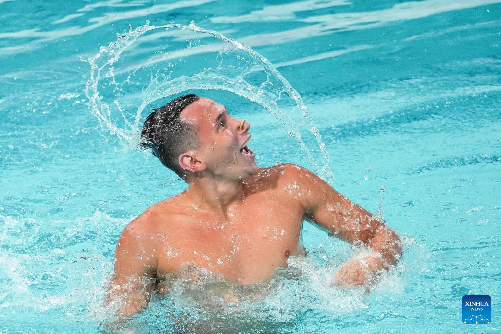 XI'AN, 14 junio, 2025 (Xinhua) -- Guo Muye, de China, compite durante la final de solo libre masculino en la Superfinal de la Copa del Mundo de Natación Artística 2025 de World Aquatics, en Xi'an, en la provincia de Shaanxi, en el noroeste de China, el 14 de junio de 2025. (Xinhua/Li Yibo)