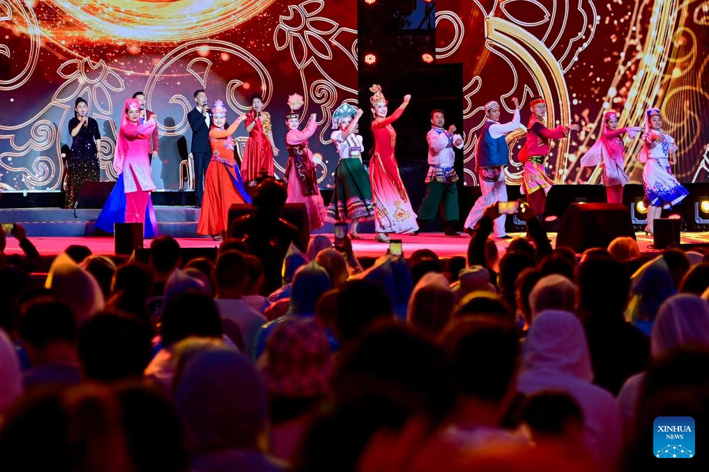 HUOCHENG, 15 junio, 2025 (Xinhua) -- Imagen del 14 de junio de 2025 de una presentación escenificada en un parque, en el distrito de Huocheng, en la región autónoma uygur de Xinjiang, en el noroeste de China. Vastos campos de lavanda en el distrito de Huocheng entraron en plena floración en junio, transformando el paisaje en un mar de color púrpura. Con presentaciones culturales, eventos deportivos y exposiciones que muestran el patrimonio local, un festival de turismo de lavanda arrancó para coincidir con este espectáculo natural, destacando la próspera industria de la lavanda de la región al tiempo que promueve el turismo local y el desarrollo económico. (Xinhua/Ding Lei)