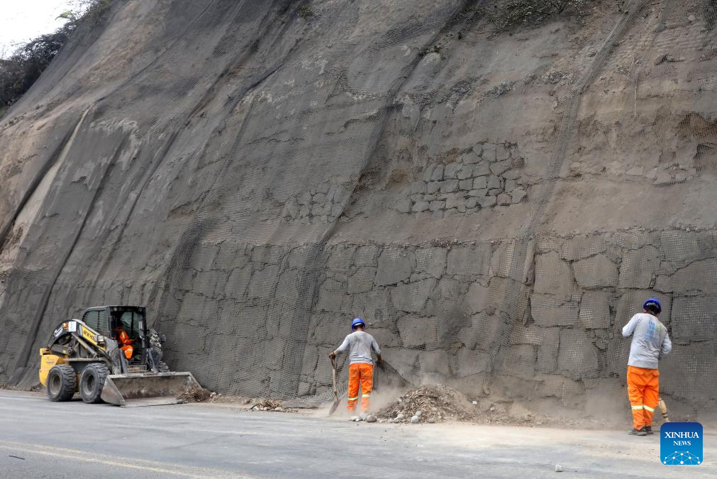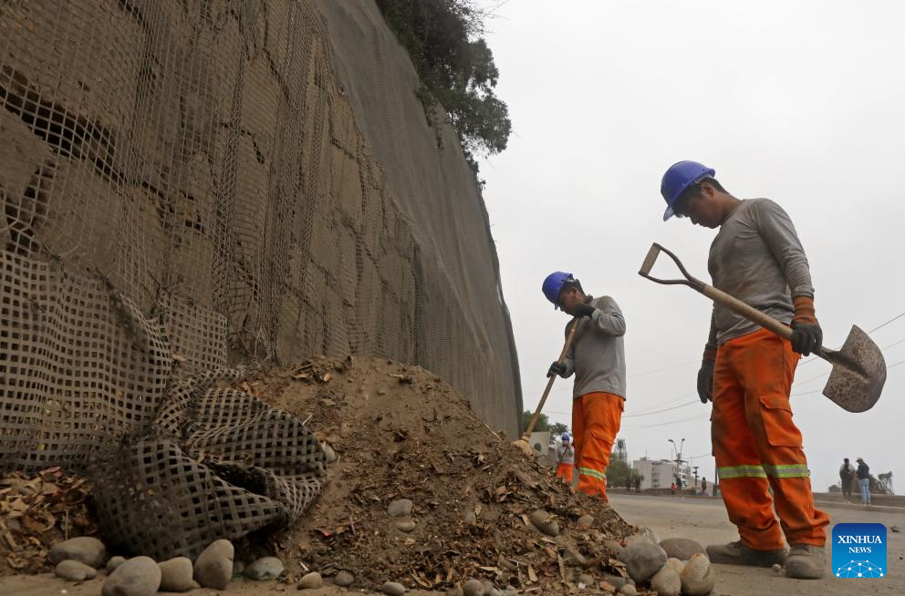 Trabajadores limpian piedras y escombros caídos después de un sismo de magnitud 6,1 en la escala de Richter, en el acantilado de la Costa Verde, en el distrito de Chorrillos, en Lima, Perú, el 15 de junio de 2025. Un sismo de magnitud 6,1 en la escala de Richter sacudió el domingo de manera intensa la capital peruana con epicentro en la provincia del Callao (centro), vecina a Lima, sin que hasta el momento se reporten daños materiales o personales, confirmó el Centro Sismológico Nacional. (Xinhua/Mariana Bazo)