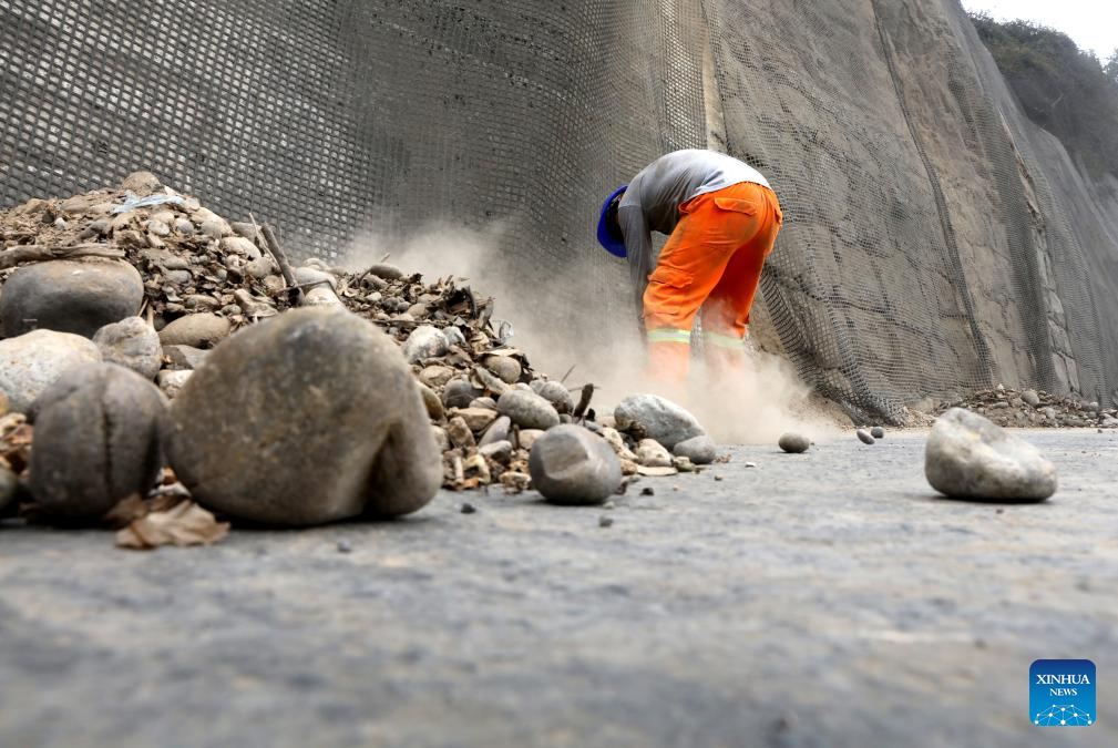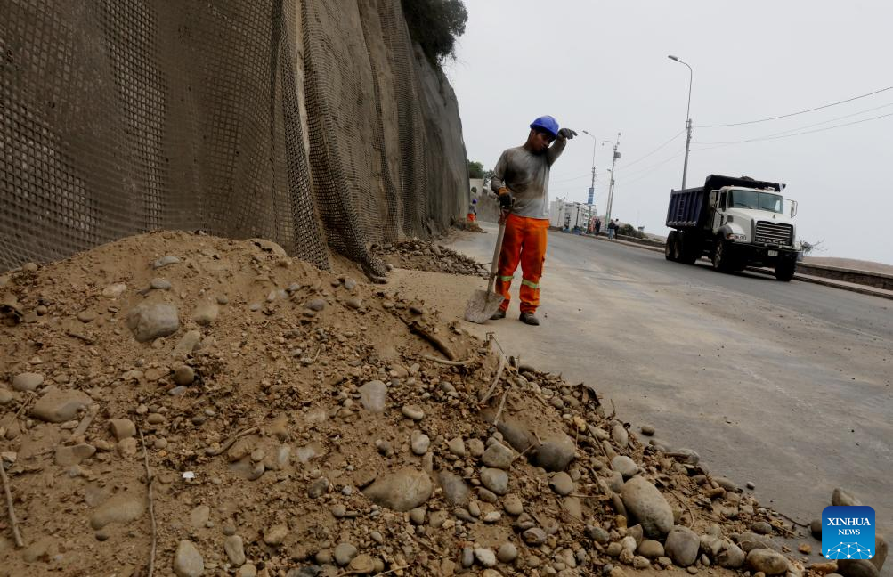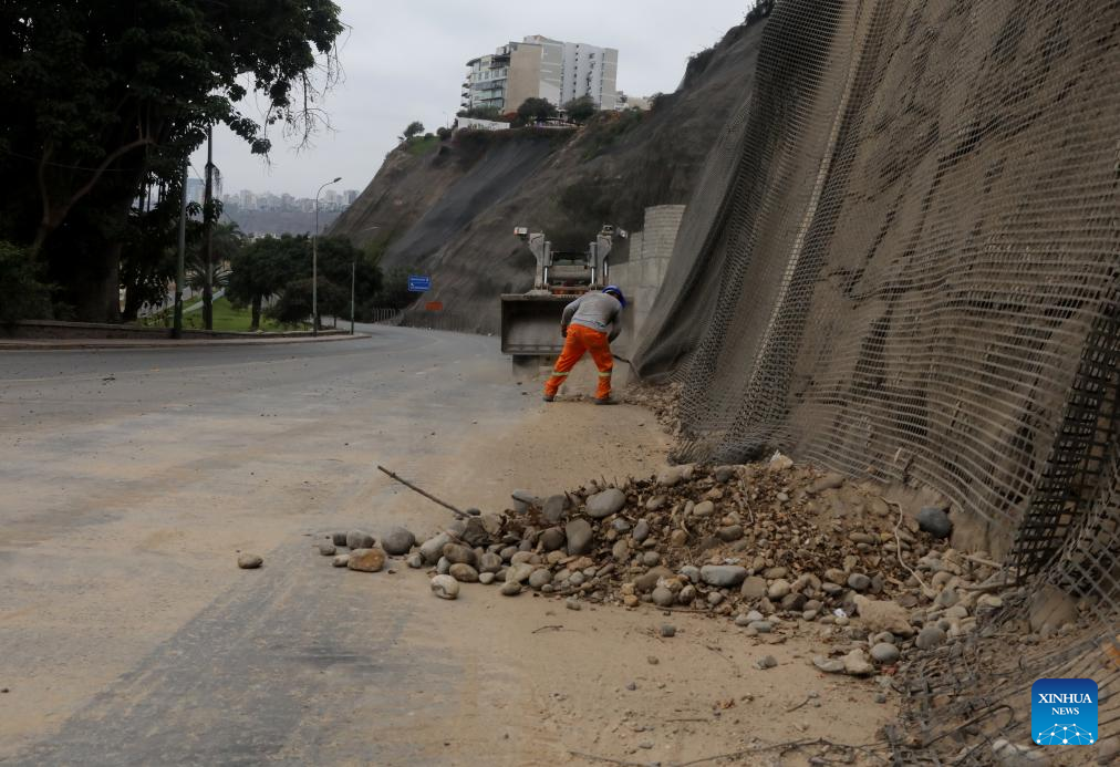 Un trabajador limpia piedras y escombros caídos después de un sismo de magnitud 6,1 en la escala de Richter, en el acantilado de la Costa Verde, en el distrito de Chorrillos, en Lima, Perú, el 15 de junio de 2025. Un sismo de magnitud 6,1 en la escala de Richter sacudió el domingo de manera intensa la capital peruana con epicentro en la provincia del Callao (centro), vecina a Lima, sin que hasta el momento se reporten daños materiales o personales, confirmó el Centro Sismológico Nacional. (Xinhua/Mariana Bazo)