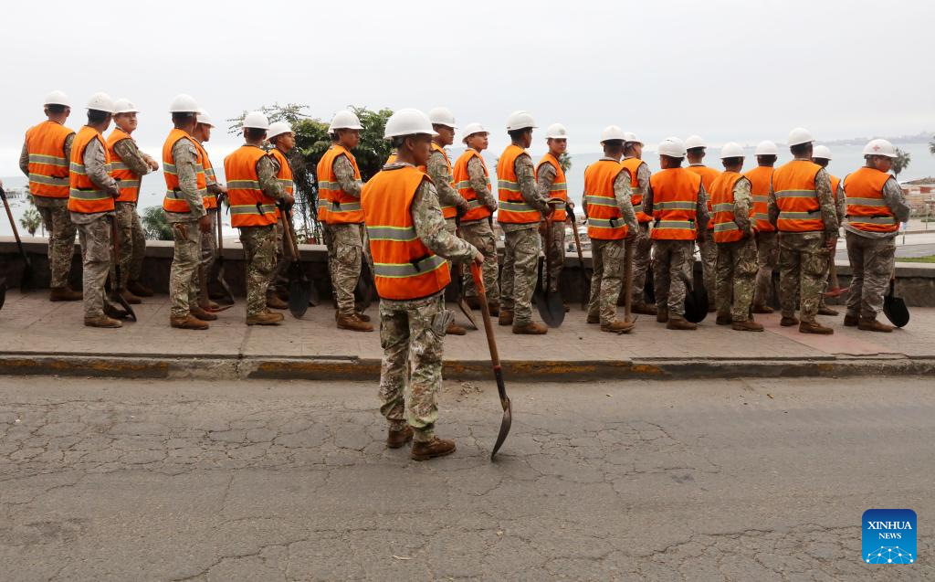 Soldados del Ejército peruano esperan para ingresar a limpiar piedras y escombros caídos después de un sismo de magnitud 6,1 en la escala de Richter, en el acantilado de la Costa Verde, en el distrito de Chorrillos, en Lima, Perú, el 15 de junio de 2025. Un sismo de magnitud 6,1 en la escala de Richter sacudió el domingo de manera intensa la capital peruana con epicentro en la provincia del Callao (centro), vecina a Lima, sin que hasta el momento se reporten daños materiales o personales, confirmó el Centro Sismológico Nacional. (Xinhua/Mariana Bazo)