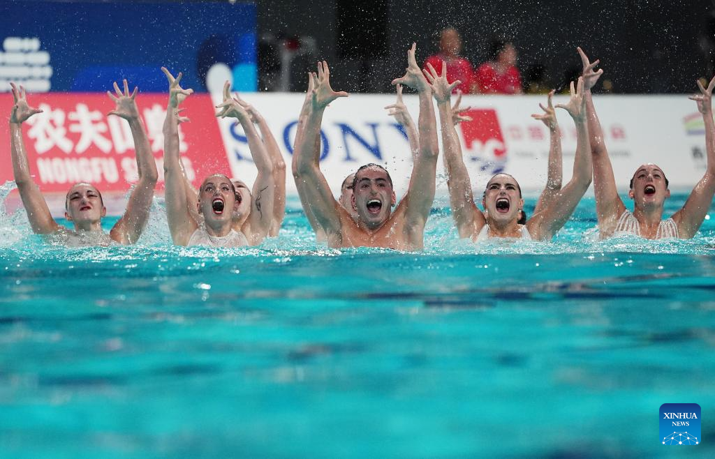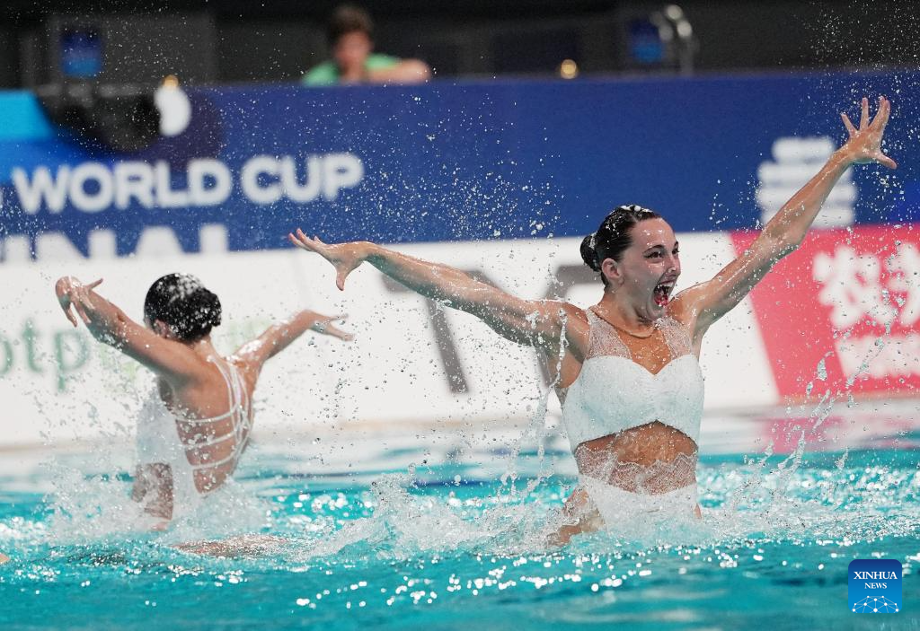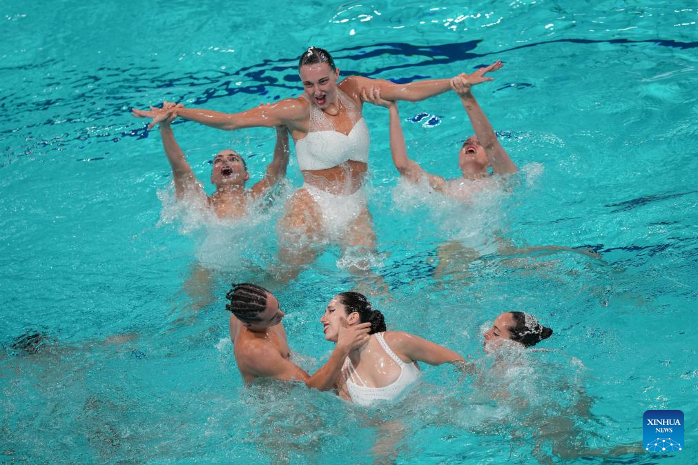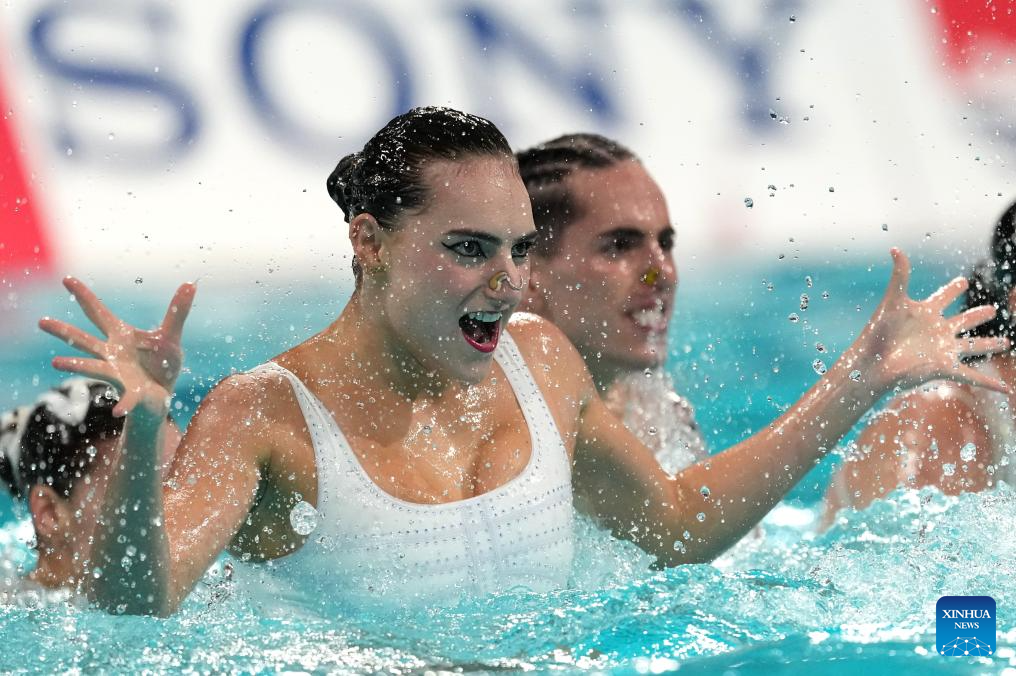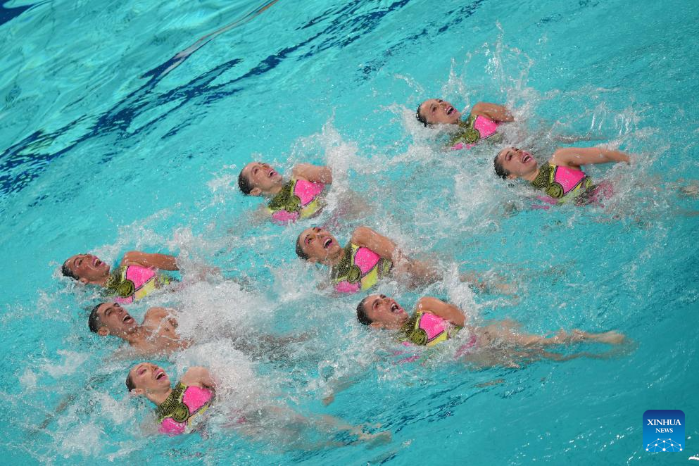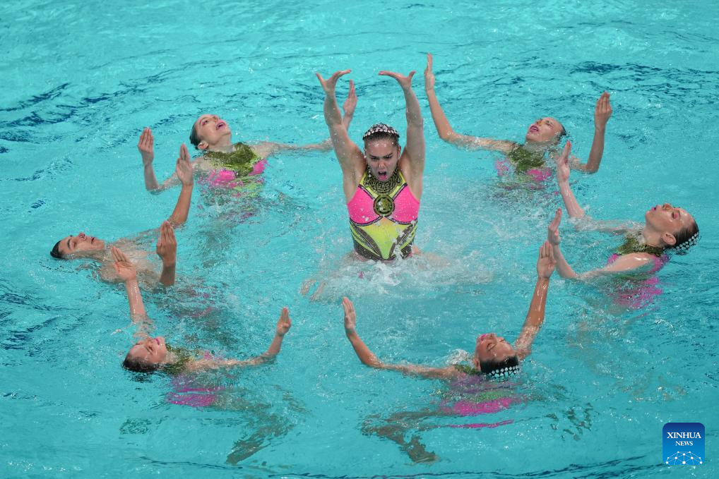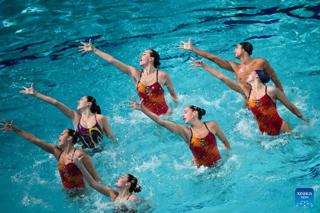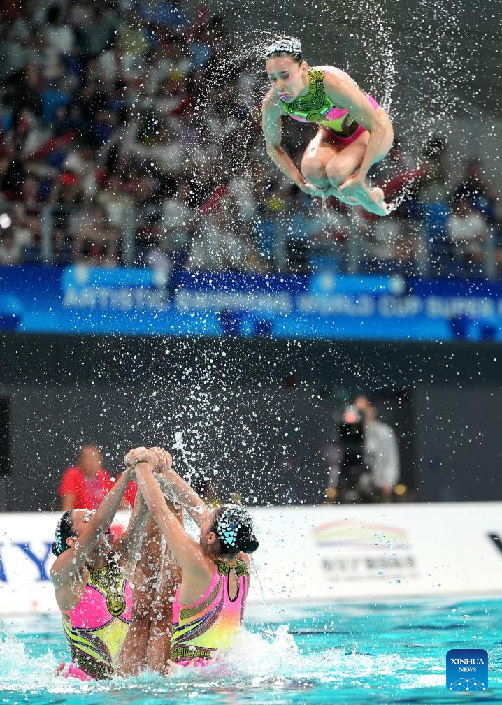 XI'AN, 15 junio, 2025 (Xinhua) -- El equipo de España compite durante el evento de equipo acrobático en la Superfinal de la Copa del Mundo de Natación Artística 2025 de World Aquatics, en Xi'an, en la provincia de Shaanxi, en el noroeste de China, el 15 de junio de 2025. (Xinhua/Li Yibo)