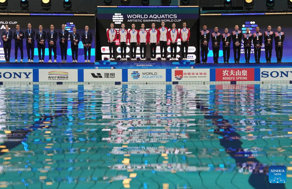 XI'AN, 15 junio, 2025 (Xinhua) -- Las medallistas de oro, el equipo de China (c), las medallistas de plata, el equipo de España (i) y las medallistas de bronce, el equipo de México, posan en el podio durante la ceremonia de premiación después del evento de equipo acrobático en la Superfinal de la Copa del Mundo de Natación Artística 2025 de World Aquatics, en Xi'an, en la provincia de Shaanxi, en el noroeste de China, el 15 de junio de 2025. (Xinhua/Li Yibo)