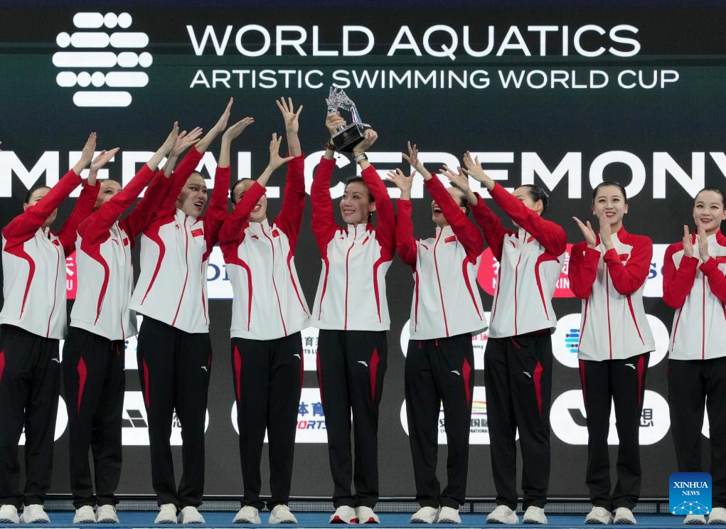 XI'AN, 15 junio, 2025 (Xinhua) -- El equipo de China posa en el podio durante la ceremonia de premiación después del evento de equipo acrobático en la Superfinal de la Copa del Mundo de Natación Artística 2025 de World Aquatics, en Xi'an, en la provincia de Shaanxi, en el noroeste de China, el 15 de junio de 2025. (Xinhua/Li Yibo)