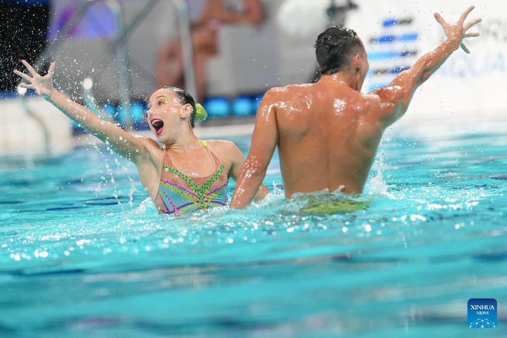 XI'AN, 15 junio, 2025 (Xinhua) -- Gustavo Adolfo Sánchez Acero/Emily Melyssa Minante Avendaño (d), de Colombia compiten durante la final de dúo libre mixto en la Superfinal de la Copa del Mundo de Natación Artística 2025 de World Aquatics, en Xi'an, en la provincia de Shaanxi, en el noroeste de China, el 15 de junio de 2025. (Xinhua/Li Yibo)