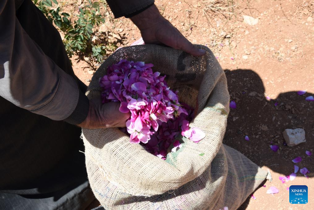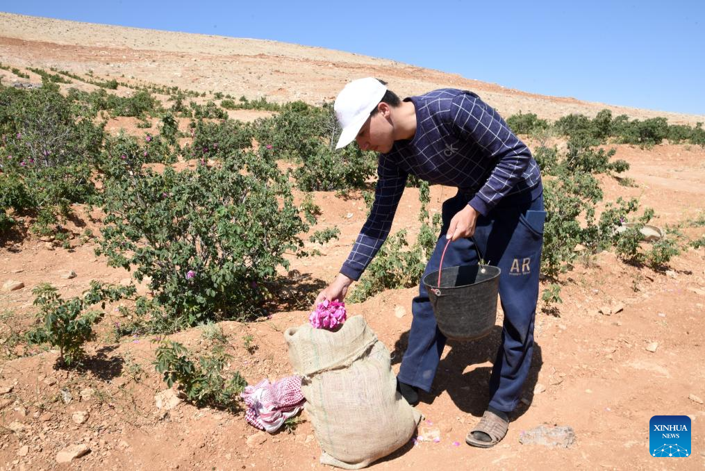 AL-MARAH, 17 junio, 2025 (Xinhua) -- Imagen del 14 junio de 2025 de un agricultor cosechando pétalos de rosa de Damasco, en el poblado de Al-Marah, Siria. Símbolo del patrimonio cultural y botánico de Siria, la rosa de Damasco ha florecido durante siglos en este agreste paisaje. Esta delicada flor, antaño pilar económico del poblado y motivo de orgullo mundial, lucha ahora por sobrevivir en medio de los cambiantes patrones climáticos. (Xinhua/Monsef Memari)