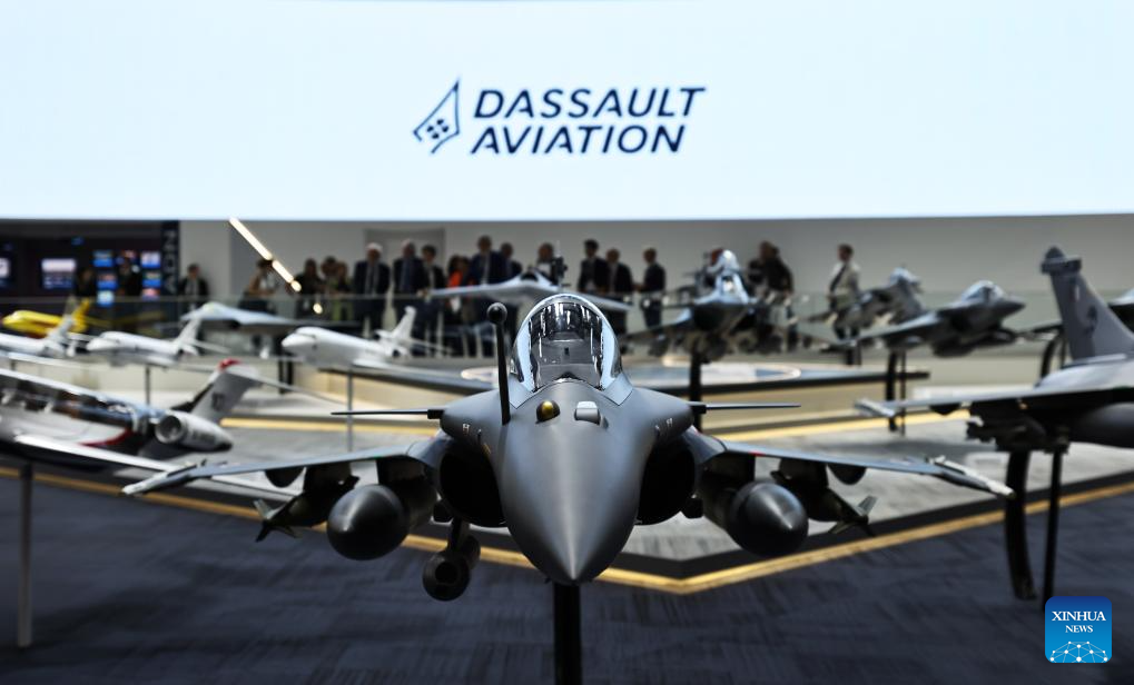 PARIS, 18 junio, 2025 (Xinhua) -- Imagen del 17 de junio de 2025 de personas visitando el estand de Dassault Aviation durante el 55 Salón Aeronáutico de París en el Aeropuerto de Le Bourget, cerca de París, Francia. La edición número 55 del Salón Aeronáutico de París fue oficialmente inaugurada el lunes y permanecerá abierta al público hasta el 22 de junio, con la participación de aproximadamente 2.400 expositores de 48 países y regiones. (Xinhua/Gao Jing)