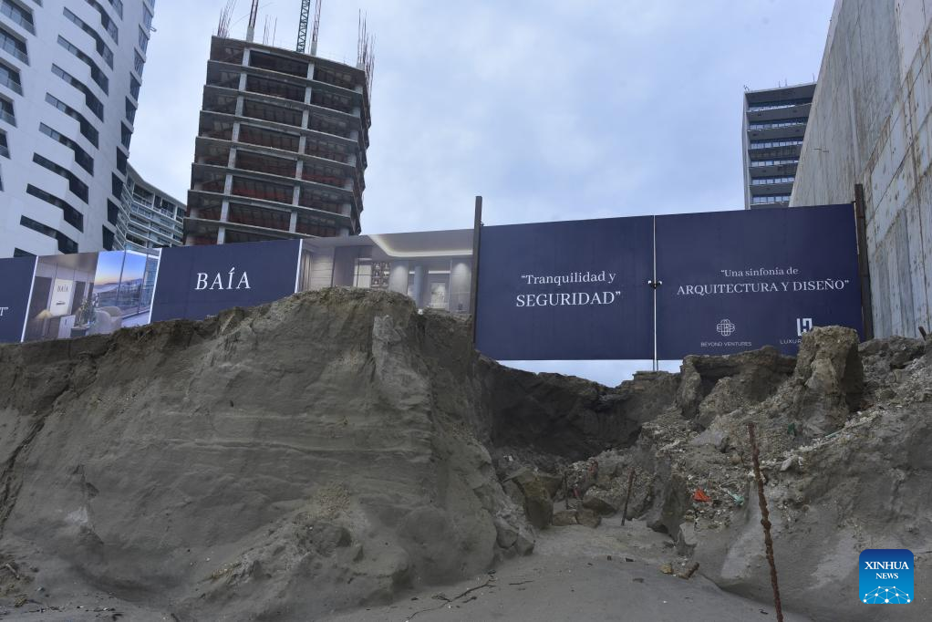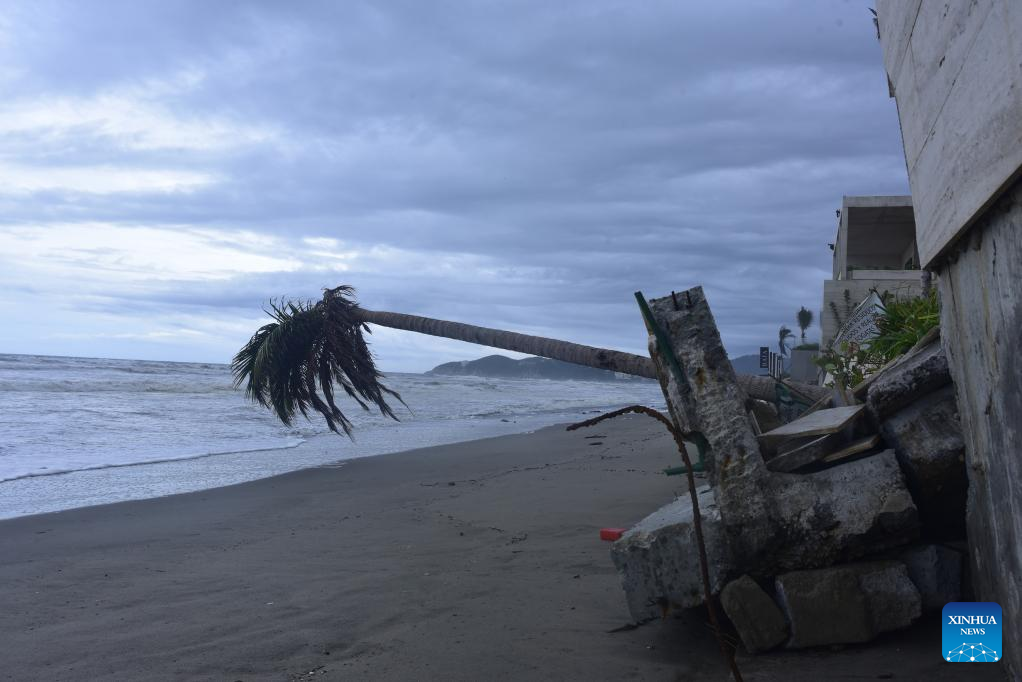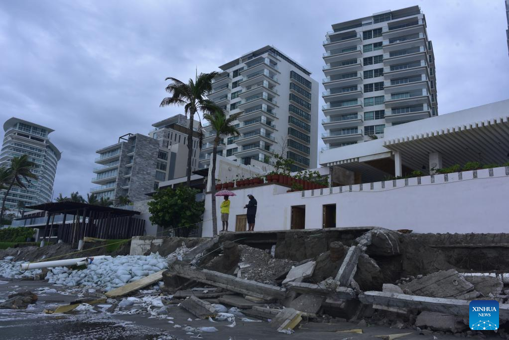 ACAPULCO, 19 junio, 2025 (Xinhua) -- Personas observan los daños en una playa durante el paso del huracán Erick, en Acapulco, estado de Guerrero, en el sur México, el 19 de junio de 2025. El huracán Erick ha provocado afectaciones relevantes en infraestructura vial, hospitales y servicios básicos durante su paso por el sur de México, informó el jueves la presidenta Claudia Sheinbaum, quien subrayó que hasta el momento no se reporta ninguna pérdida humana. (Xinhua/Str)