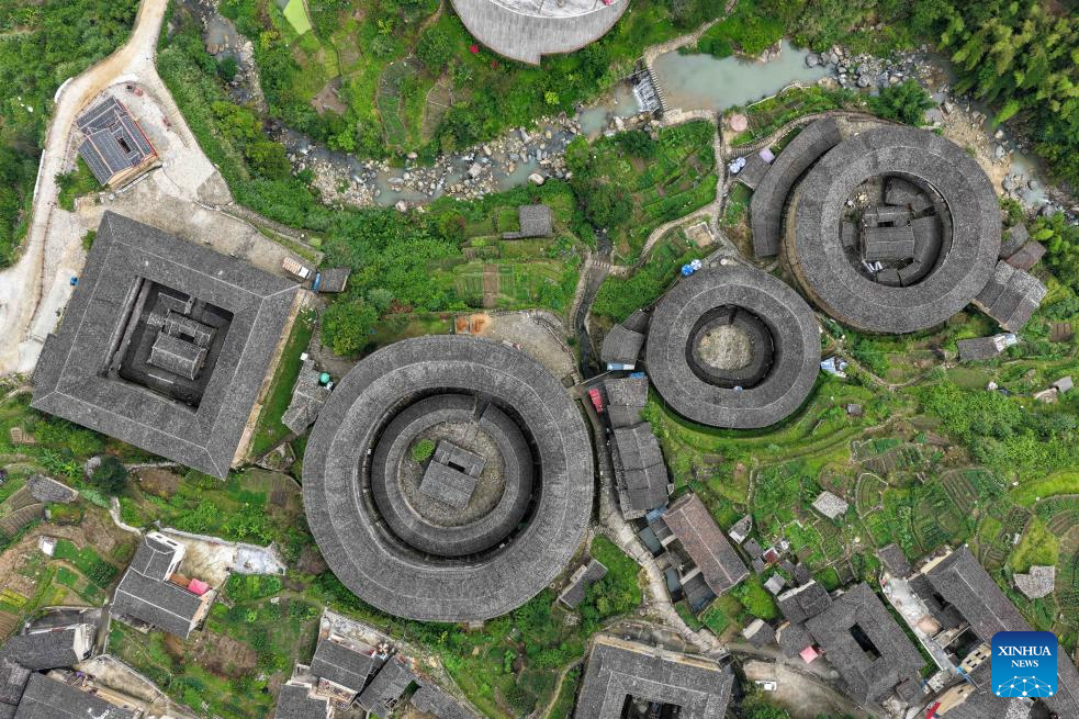 LONGYAN, 20 junio, 2025 (Xinhua) -- Vista aérea tomada con un dron el 22 de mayo de 2025 del conjunto de Tulou de Chuxi, en Longyan, en la provincia de Fujian, en el sureste de China. El Tulou de Fujian, la singular arquitectura residencial de la provincia de Fujian construida entre los siglos XV y XX, fue inscrita en la Lista del Patrimonio Mundial de la UNESCO en 2008. (Xinhua/Zhang Keren)