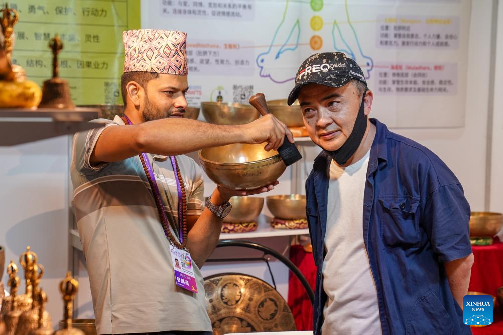 KUNMING, 21 junio, 2025 (Xinhua) -- Un visitante (d) experimenta con un cuenco cantor nepalí, una especie de herramienta para terapia de sonido, en el Pabellón del Sur de Asia durante la IX Exposición China-Sur de Asia, en Kunming, en la provincia de Yunnan, en el suroeste de China, el 21 de junio de 2025. El evento de seis días de duración, inaugurado el jueves en Kunming, cuenta con 16 salas de exposición. Cerca de 500 empresas de ocho países del sur de Asia participan en el evento. (Xinhua/Peng Yikai)