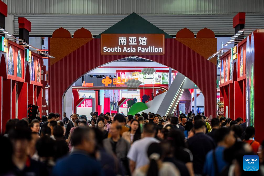 KUNMING, 21 junio, 2025 (Xinhua) -- Personas visitan el Pabellón del Sur de Asia durante la IX Exposición China-Sur de Asia, en Kunming, en la provincia de Yunnan, en el suroeste de China, el 21 de junio de 2025. El evento de seis días de duración, inaugurado el jueves en Kunming, cuenta con 16 salas de exposición. Cerca de 500 empresas de ocho países del sur de Asia participan en el evento. (Xinhua/Hu Chao)
