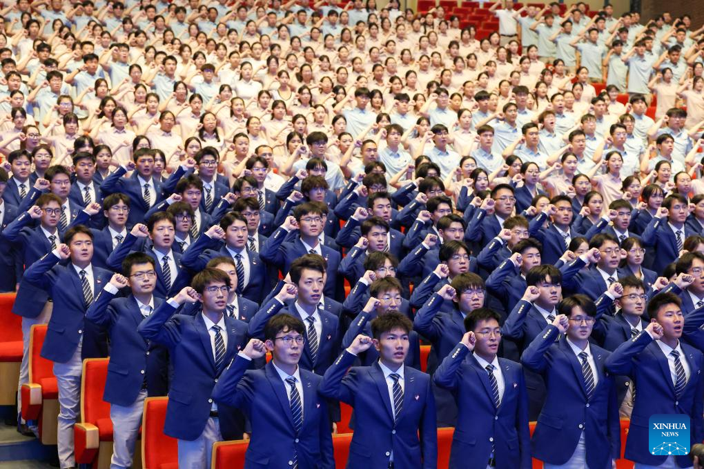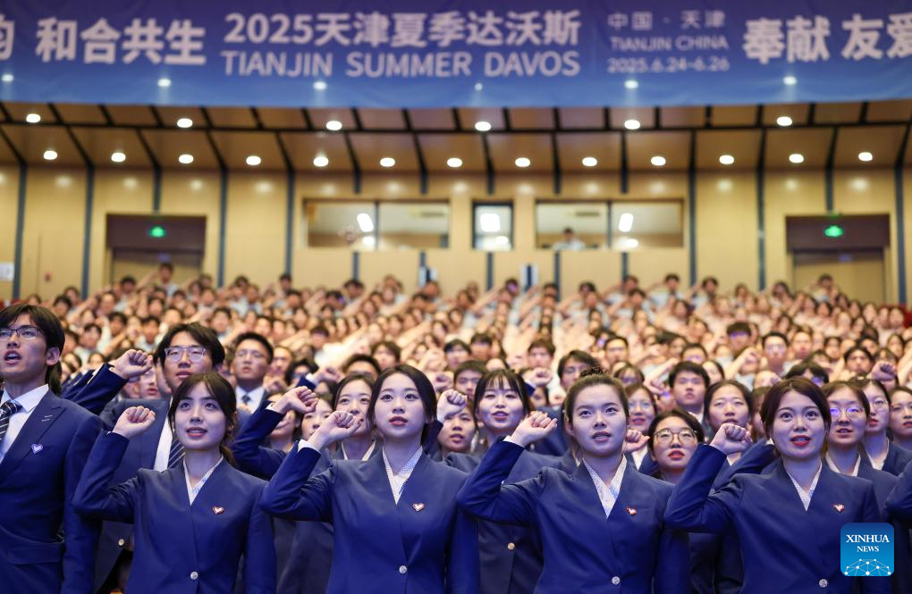 TIANJIN, 21 junio, 2025 (Xinhua) -- Voluntarios para el foro Davos de Verano 2025 prestan juramento en una ceremonia, en Tianjin, en el norte de China, el 21 de junio de 2025. El foro Davos de Verano 2025 se celebrará del 24 al 26 de junio en Tianjin. Un total de 972 voluntarios de 12 universidades de la ciudad desempeñarán funciones en más de 50 categorías, incluyendo la recepción, la promoción de medios, el apoyo al transporte y la asistencia a la conferencia. (Xinhua/Sun Fanyue)