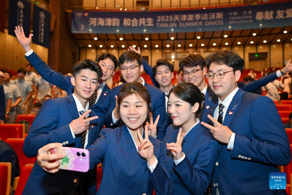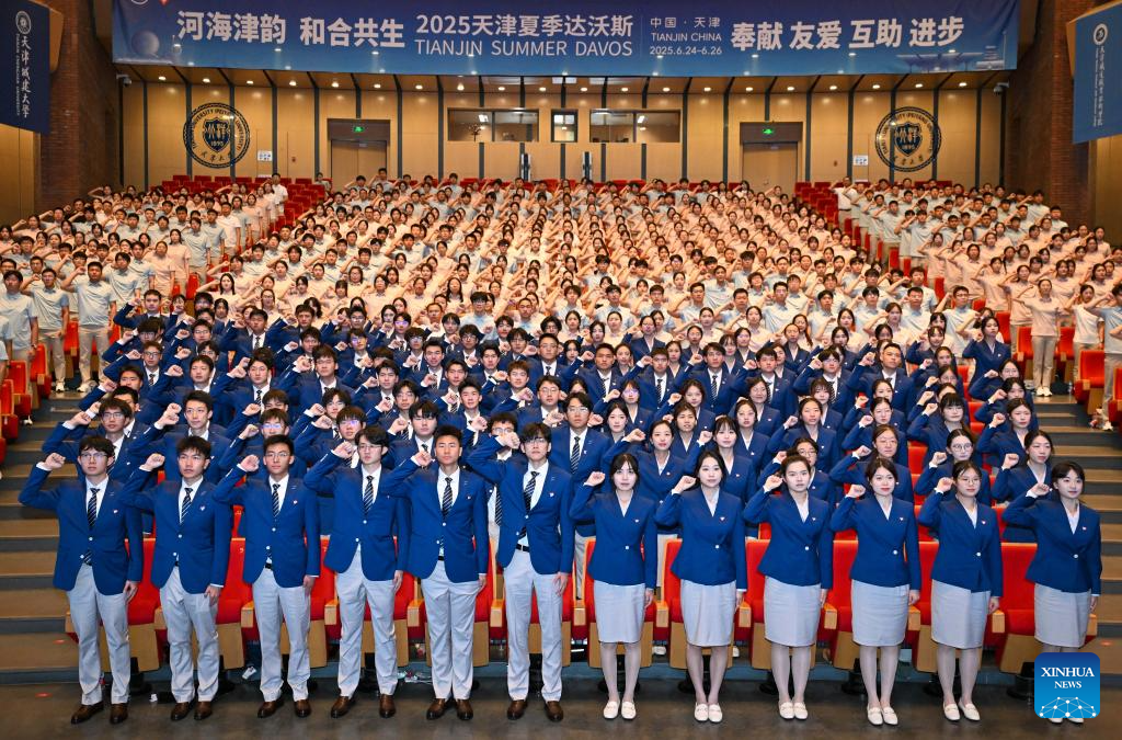 TIANJIN, 21 junio, 2025 (Xinhua) -- Voluntarios para el foro Davos de Verano 2025 posan para fotografías después de prestar juramento en una ceremonia, en Tianjin, en el norte de China, el 21 de junio de 2025. El foro Davos de Verano 2025 se celebrará del 24 al 26 de junio en Tianjin. Un total de 972 voluntarios de 12 universidades de la ciudad desempeñarán funciones en más de 50 categorías, incluyendo la recepción, la promoción de medios, el apoyo al transporte y la asistencia a la conferencia. (Xinhua/Sun Fanyue)